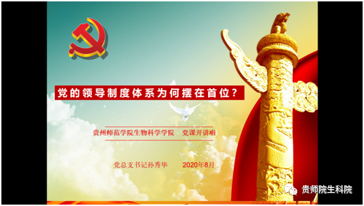 首先孙秀华同志以“党的领导制度体系为何摆在首位”为主题,从“众星捧月定海神针”、“事在四方要在中央”和“贯穿全局贯彻到底”三个部分为全体教师党员讲解了党的领导制度体系为何摆在首位。孙秀华同志要求,全体党员教师要毫不动摇地坚持和完善,为确保全党在思想上政治上行动上同以习近平同志为核心的党中央保持高度一致提供有力制度保证。