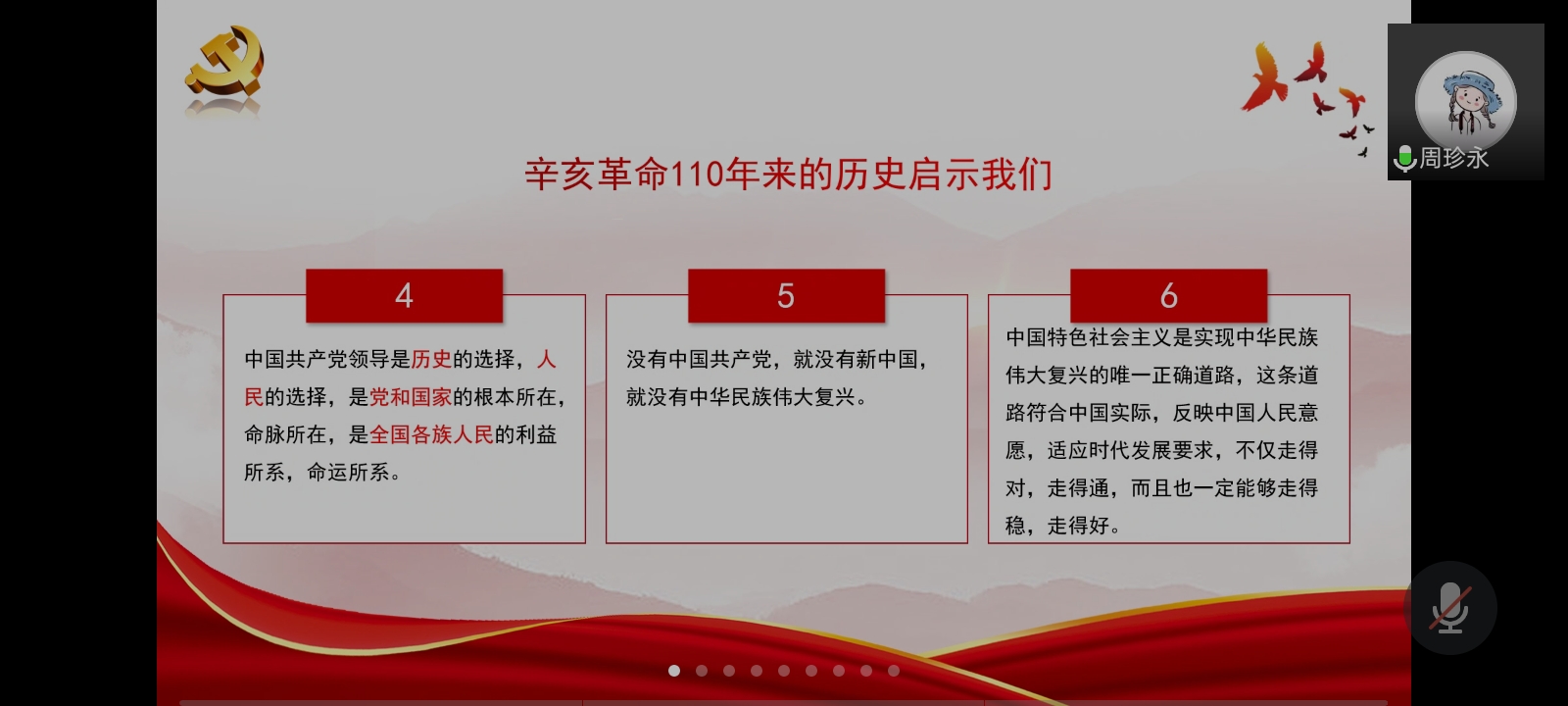 为引导员工党员认真学习习近平总书记重要讲话精神,感受先辈们的牺牲精神和伟大的革命情怀,学习和弘扬他们为振兴中华而矢志不渝的崇高精神。10月18日晚,威廉williamhill体育员工党支部于腾讯会议开展“弘辛亥革命精神,担振兴中华之使命”党课学习。参与本次活动的有全体正式党员及预备党员。