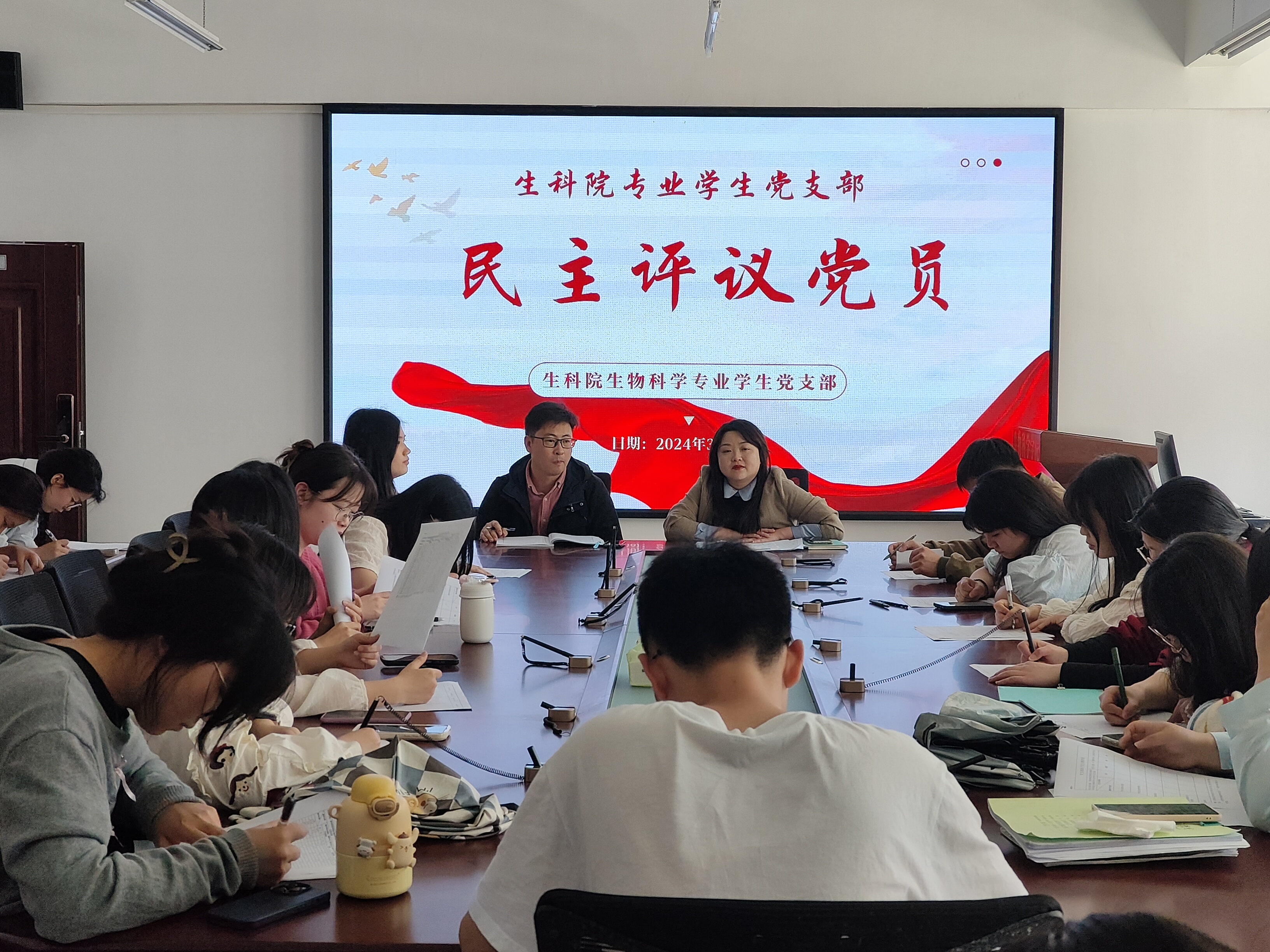 会上,王珏明确会议任务,从履职尽责抓党建情况、存在问题、下一步工作要点三个方面进行,并讲述了履职尽责抓党建情况的六个要求:严格发展党员和教育管理服务;加强党支部作用发挥;加强政治理论武装;履行支部党建责任;强化支部堡垒建设;严明政治纪律,加强作风建设。随后向大家讲述党支部现有存在的问题,王珏就如何解决问题让大家展开讨论,员工党员们纷纷踊跃回答,进行自检,并做相应记录。最后,王珏讲述下一步工作要点是推动党建工作方式创新、创新党建工作机制、深化创新争优、加强党风廉政建设,并从四个方面进行了深入讲解。讲解完后王珏向党员们介绍了“民主评议党员”的功能和好处,并在会中选出了为下期入党积极分子发言点评的人员。随后,支部全体正式党员就支部党建工作、优秀党员等进行了无记名投票,并得出评议结果。