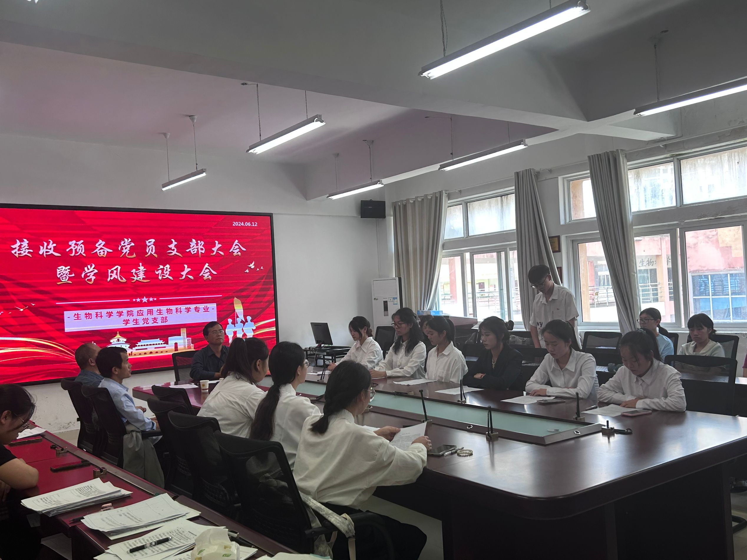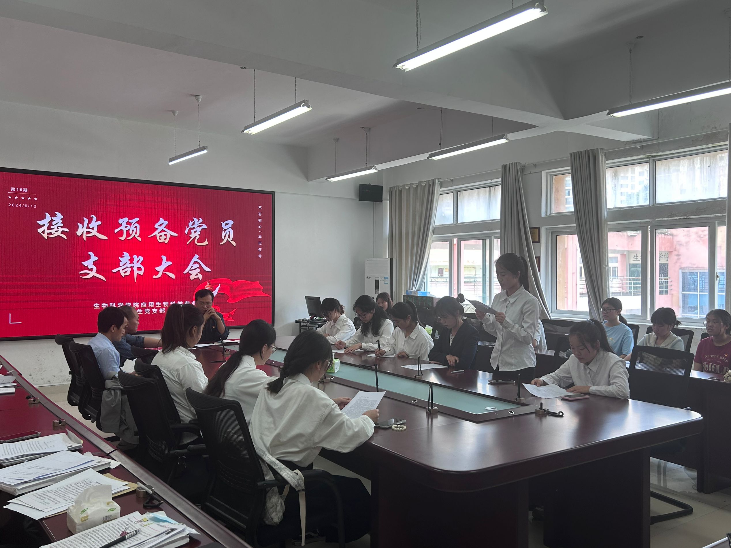 大会开始由主持人介绍到场人数及支议议程,本支部党员共23人,其中正式党员17人,预备党员6人,正式党员实到17人,符合开会条件,计票人为杨韩奕琪,监票人为陈发玲。紧接着,大会讨论是否接收金开英等9名同志为预备党员。流程具体如下:首先由金开英等9名同志宣读入党志愿书,并进行批评和自我批评(即向支部党员大会汇报自己在预备期间的表现,肯定成绩和进步,找出缺点和不足,表明自己的态度和决心)。接着由入党介绍人介绍发展对象有关情况,并对其能否接收为预备党员表明意见。然后由员工党支部副书记介绍对发展对象的审查情况,并提出能否接收为预备党员的意见:金开英等9名同志的审查情况为:各程序完整,本人及家属政治历史清楚,政审合格,通过查阅入党材料,材料齐全,程序规范,预审合格。支部大会进行表决(采用无记名投票)。由主持人宣布票决结果。紧接着由正式党员同志领学学风建设,其中重点提到,作为一名合格的党员应积极保持良好学习习惯,提升自身综合素质。