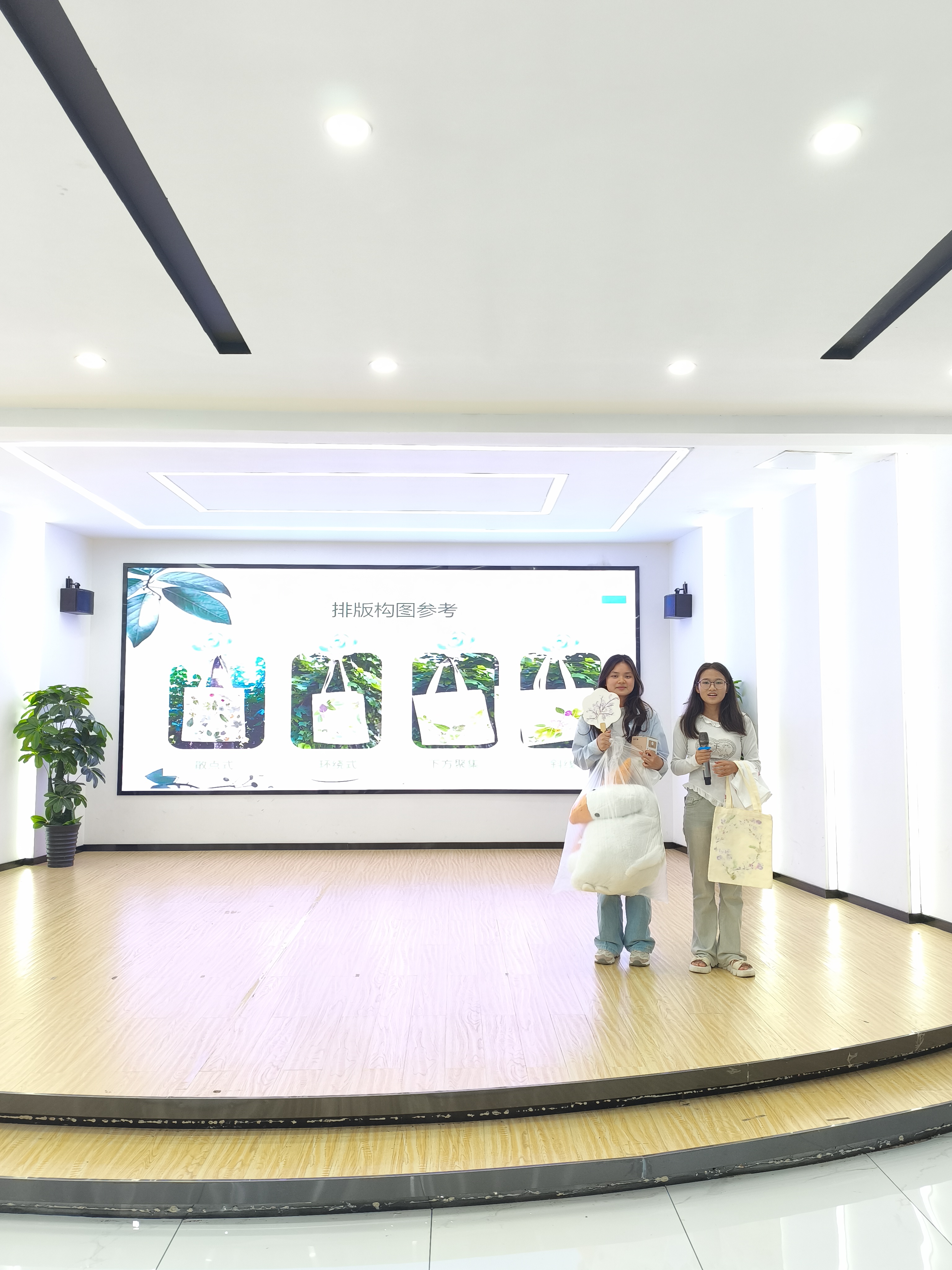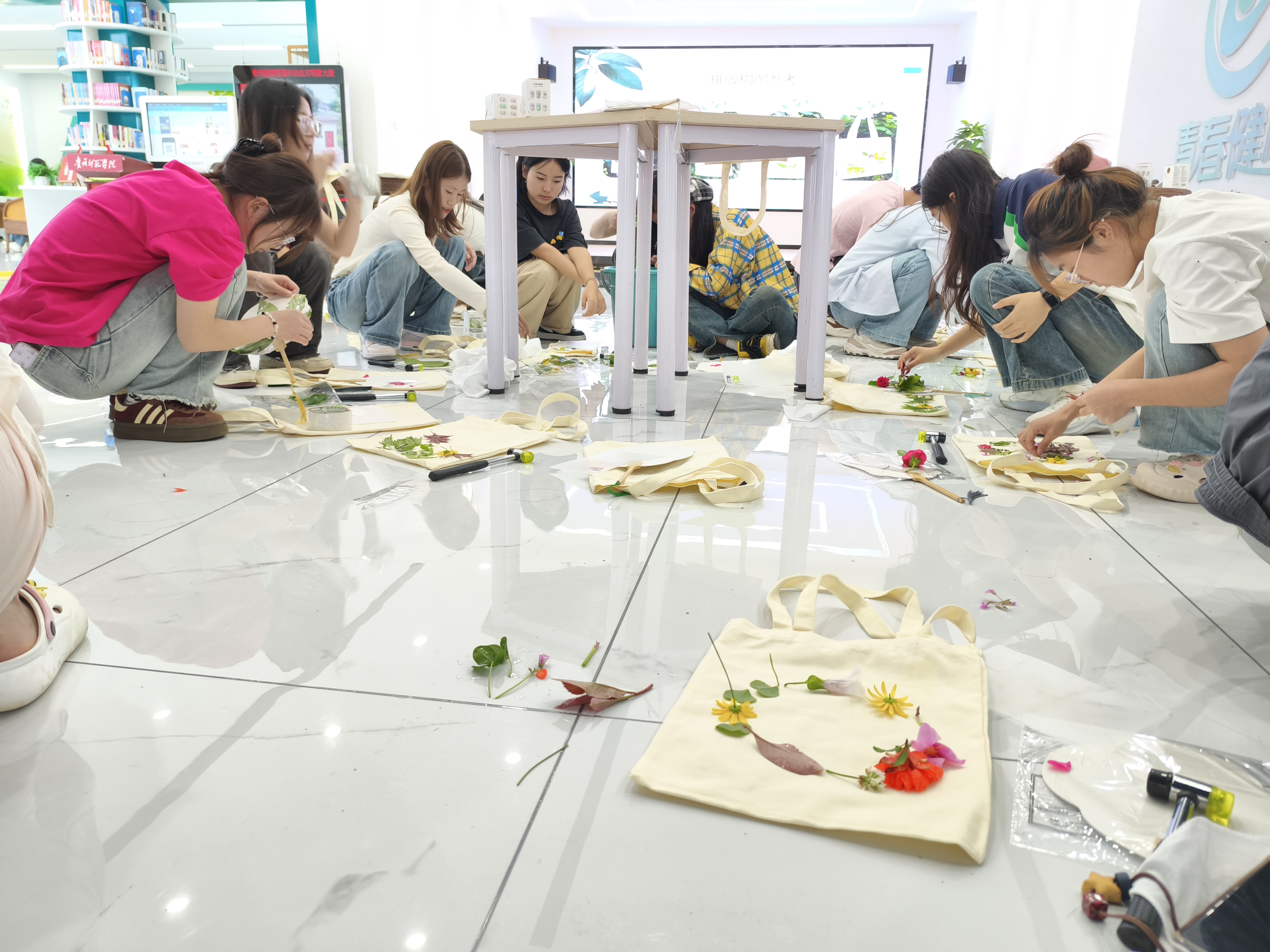 在植物拓印环节,工作人员孙国鲜详细讲解了拓印技巧并现场示范。同学们充分发挥创意,将叶片、花瓣精心排列在帆布袋、T恤、扇子以及手帕上,通过敲打拓印出自然的纹路与色彩。每一件作品都承载着独特的构思,展现了参与者对美的感知与内心的表达。创作完成后,大家踊跃分享作品背后的故事,并在交流群中展示成果。最终,工作人员评选出优秀作品,并颁发蓝牙音响、水杯、玩偶双肩包等奖品。