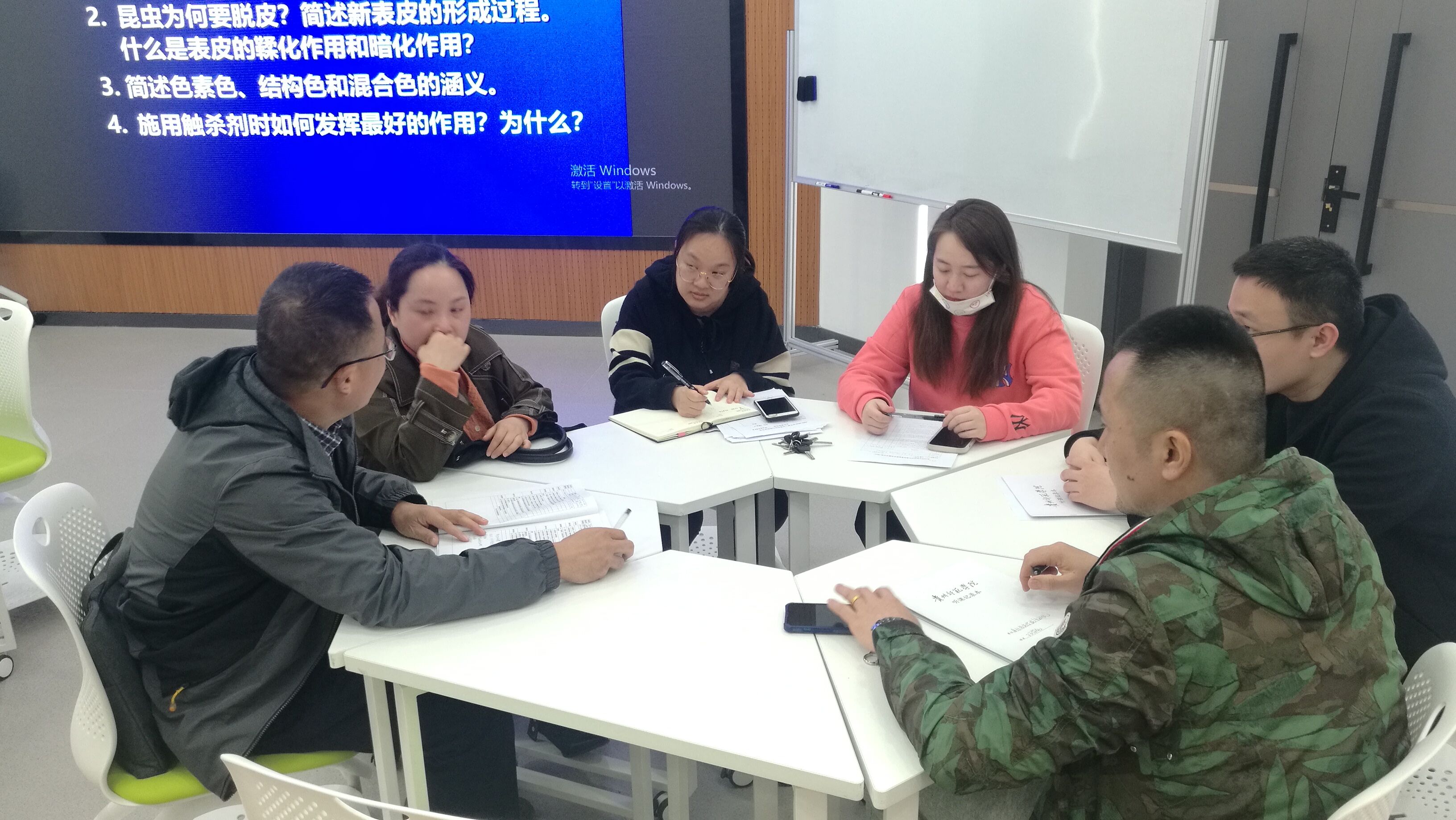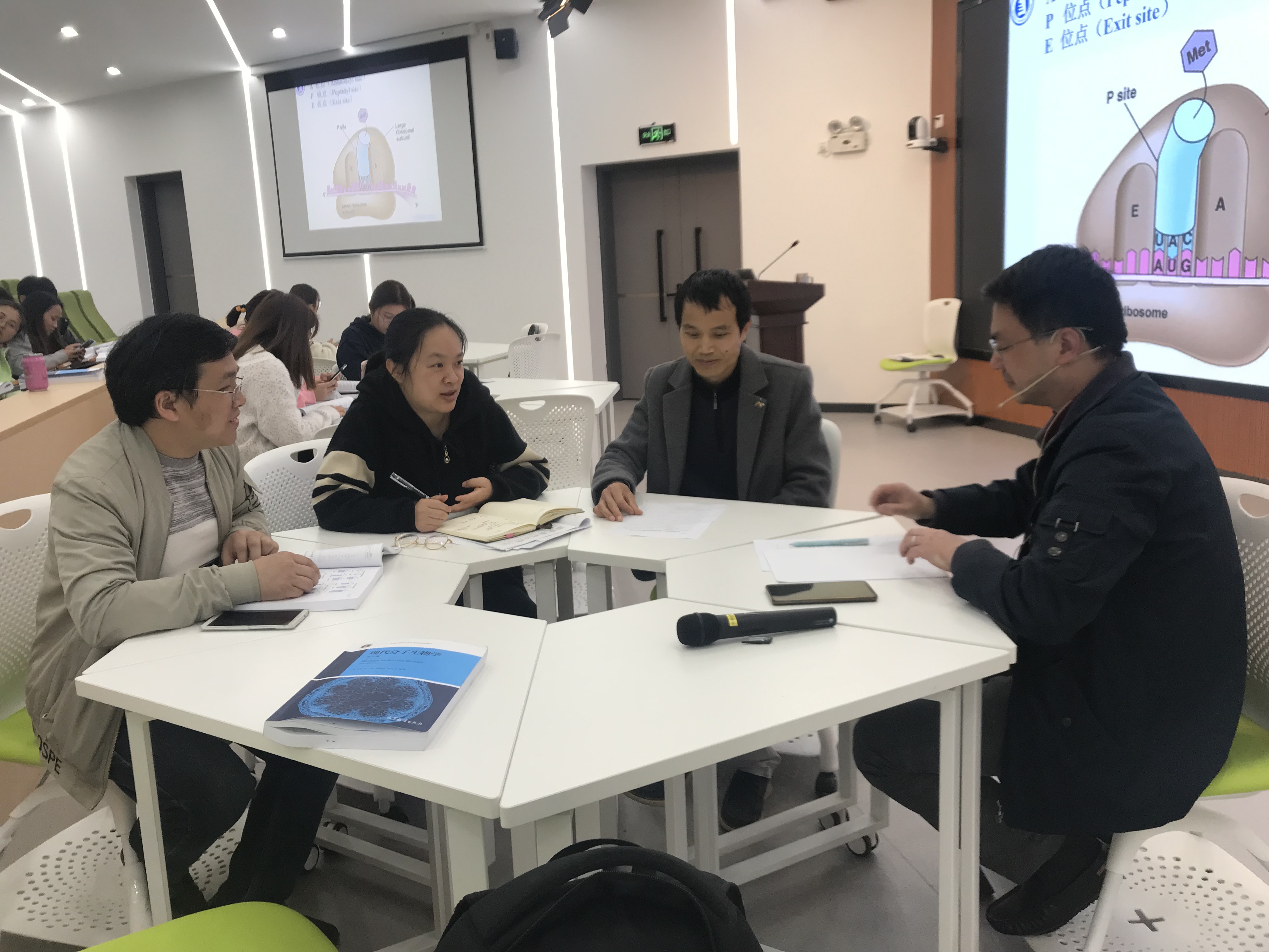 在分子生物学课堂中,廖兴刚老师结合精美的动画和板书向同学们展示了蛋白质翻译过程所需原料、步骤,让复杂、抽象的分子生物学变得易懂,同时,廖老师在授课过程中融入专业英语,潜移默化中提高了同学阅读专业外文文献的能力。杨燕老师采用了小组讨论教学方法,以解决实际问题为导向,启发员工思考,将理论联系实际。两位老师的课堂教学设计思路清晰,上课节奏把控较好,注重员工反应,课堂气氛较好。 课后,参与听课的老师围绕教学内容、教学方式、教学手段、课堂掌控等方面进行了评课,提出了宝贵的建议。