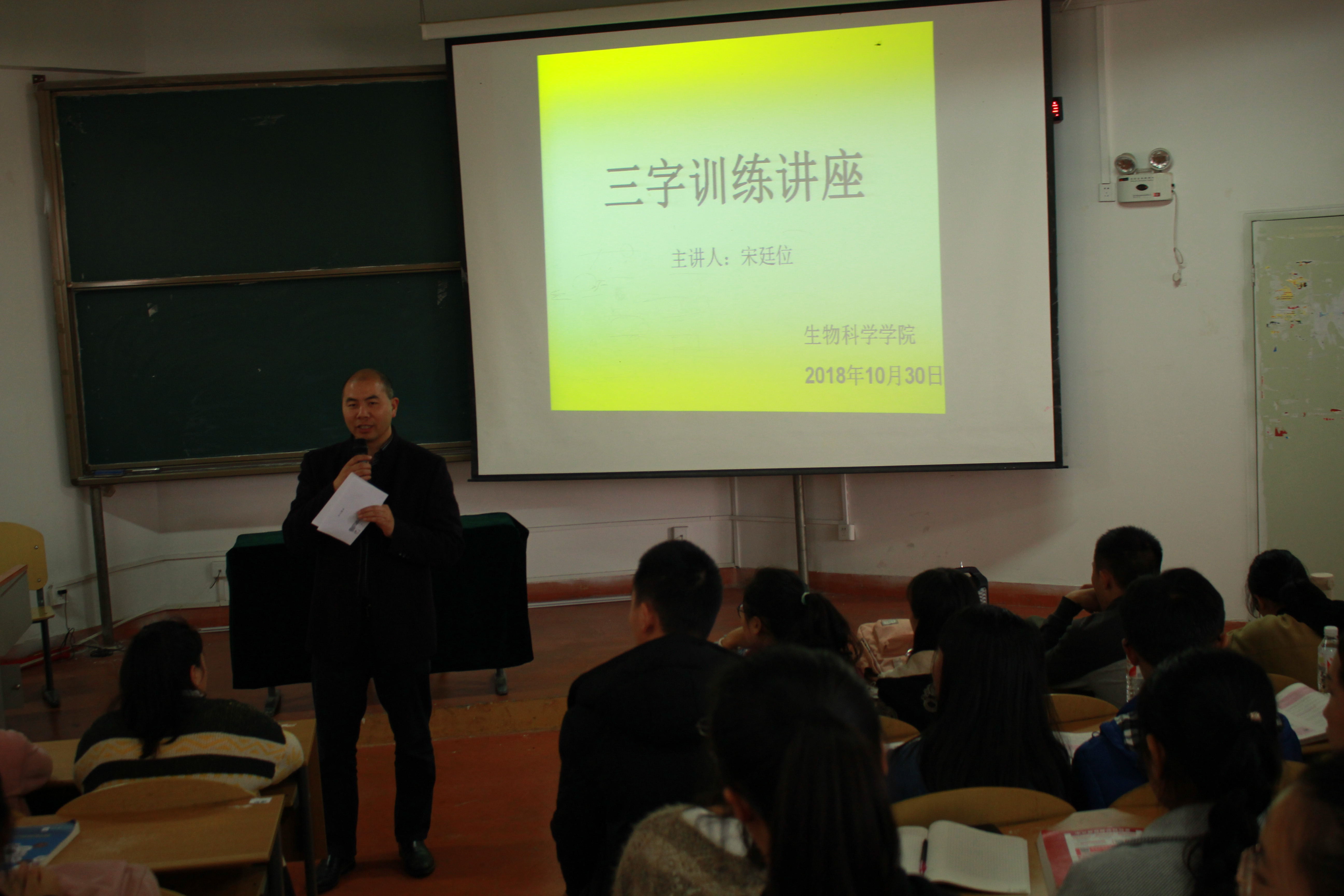 10月30日下午宁静楼437教室,威廉williamhill体育诚邀书法博士、教授宋廷位举行“三字训练”培训讲座,公司16级、17级生物科学专业的全体同学、教学科研科科长吴超参加培训,讲座由生科院副经理孟泽彬主持。