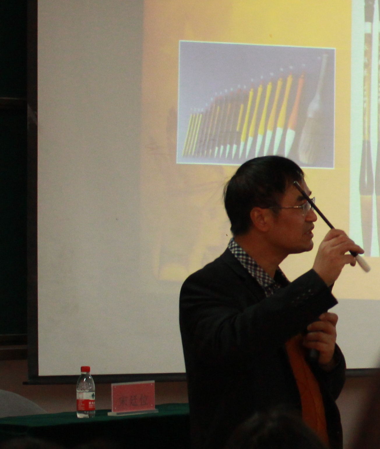 讲座伊始,孟泽彬简要介绍了宋廷位教授的基本情况,以及本次培训的目的。紧接着,宋教授开始了正式讲座。宋廷位从毛笔书法、硬笔书法两个方面,由浅入深向同学们一一讲解了毛笔字的选用、正确的书写姿势、硬笔楷书和行草书的结字方式以及粉笔字的正确写法。他强调,想要练好“三字”书法,除了掌握好执笔要领、书写要领——起、行、收之外,还要持之以恒的进行书写练习。随后,他带领着同学们一起欣赏了优秀书法临摹范本和书法作品。讲座获得了同学们一致的好评。