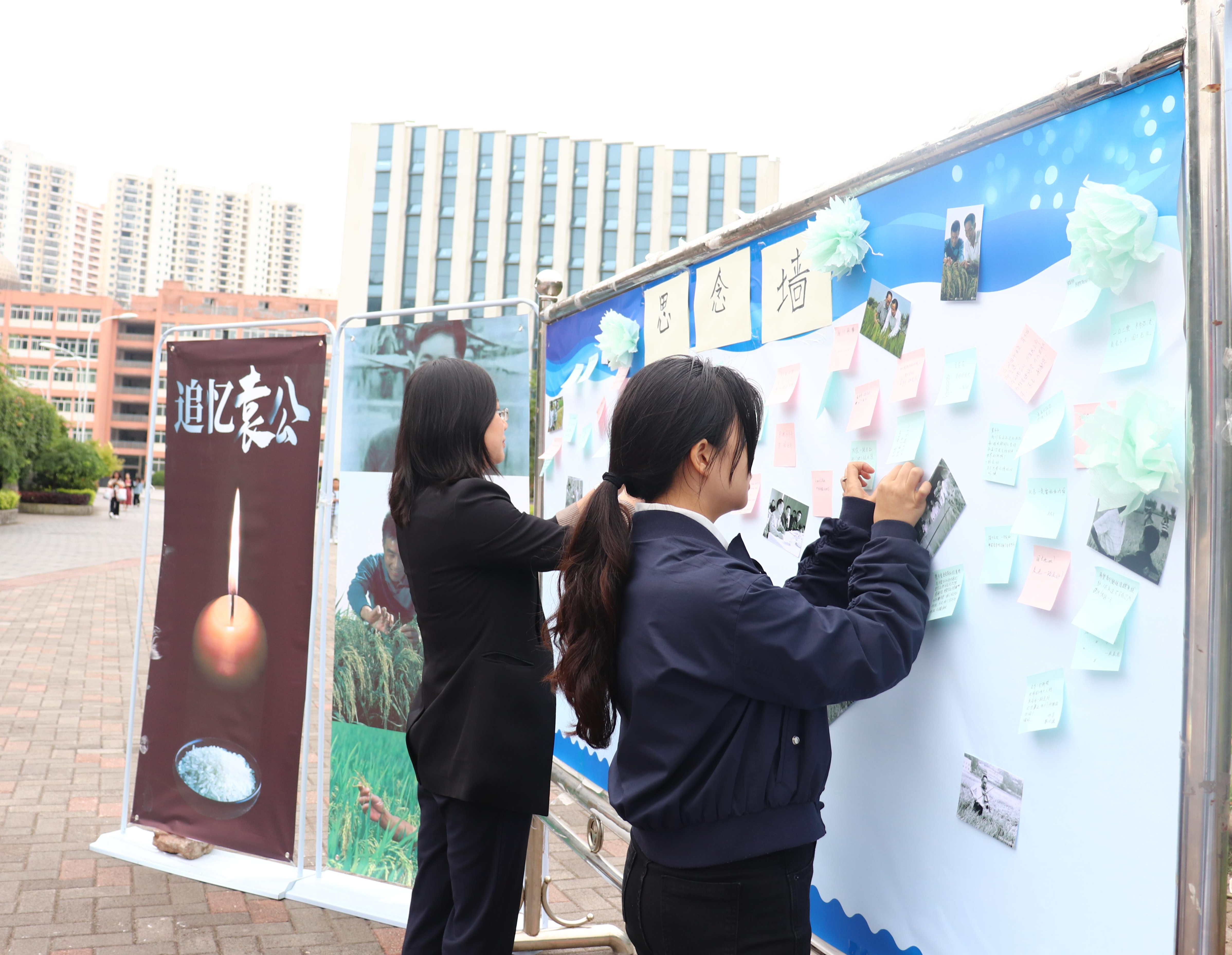 本次活动以制作白花、写寄语及宣传袁隆平生平事迹等方式来缅怀袁隆平。活动中,志愿者们积极引导参与的同学写寄语粘贴在展板;耐心地在现场教学教他们制作小白花。虽下着细雨,但每一个人都怀着沉重的心情认真地阅读展板上袁隆平的生平事迹简介:他一生致力于杂交水稻技术的研究、应用与推广,创建超级杂交稻技术体系,为我国粮食安全、农业科学发展和世界粮食供给作出杰出贡献。期间,公司员工党支部书记王溯、团委书记梁涛、组织委员李育芳及教师赵月梅、武燕等也参与到活动中去,一起缅怀袁隆平。最后,为期一天的志愿活动在合照当中圆满结束。