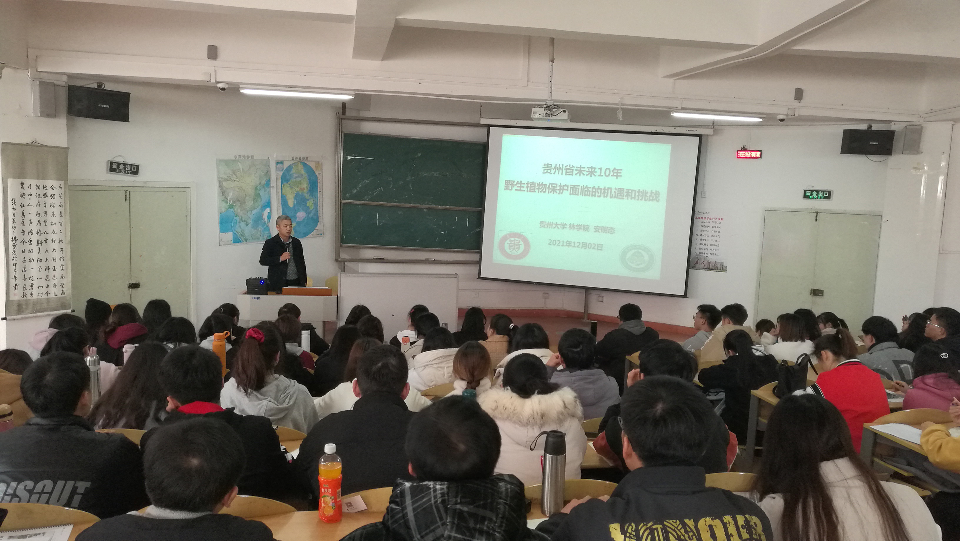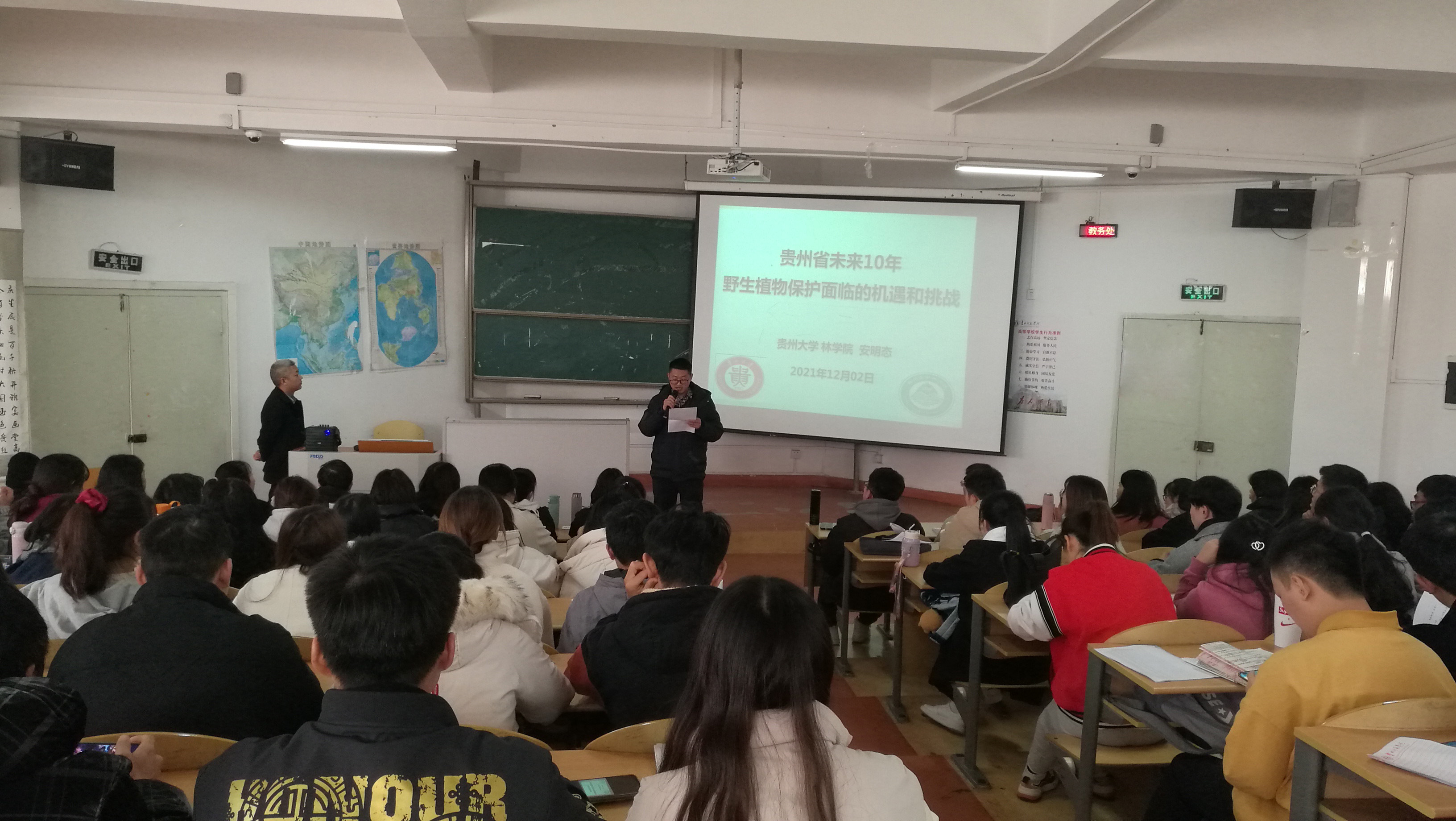 讲座开始,钱长江简要介绍了安明态老师在教学、科研等方面的基本情况,对其前来为同学们做讲座表示热烈欢迎和衷心的感谢。在讲座中,安明态老师介绍了贵州省野生植物名录、贵州省拥有丰富多样的野生植物的原因,以及贵州省对保护野生植物的对策。安明态老师指出贵州省处于四大山脉、武陵山、苗岭、乌蒙山、大楼山和八大水系的区域,这使贵州省具有独特的地形地貌、气候,指出进行野生植物保护刻不容缓,并列举了贵州省地形地貌的不同和西北、东南各地的气候、温度等不同,对各地植物采取的保护措施各不相同。在各区域建立植物园,对野生植物进行收集和保护,挖掘、构建和优化特色资源,把近年来的基础调查成果用于全省自然保护区,实行就地保护。同时介绍了许多国家重点保护植物,特别强调应依法对植物进行保护和收集。