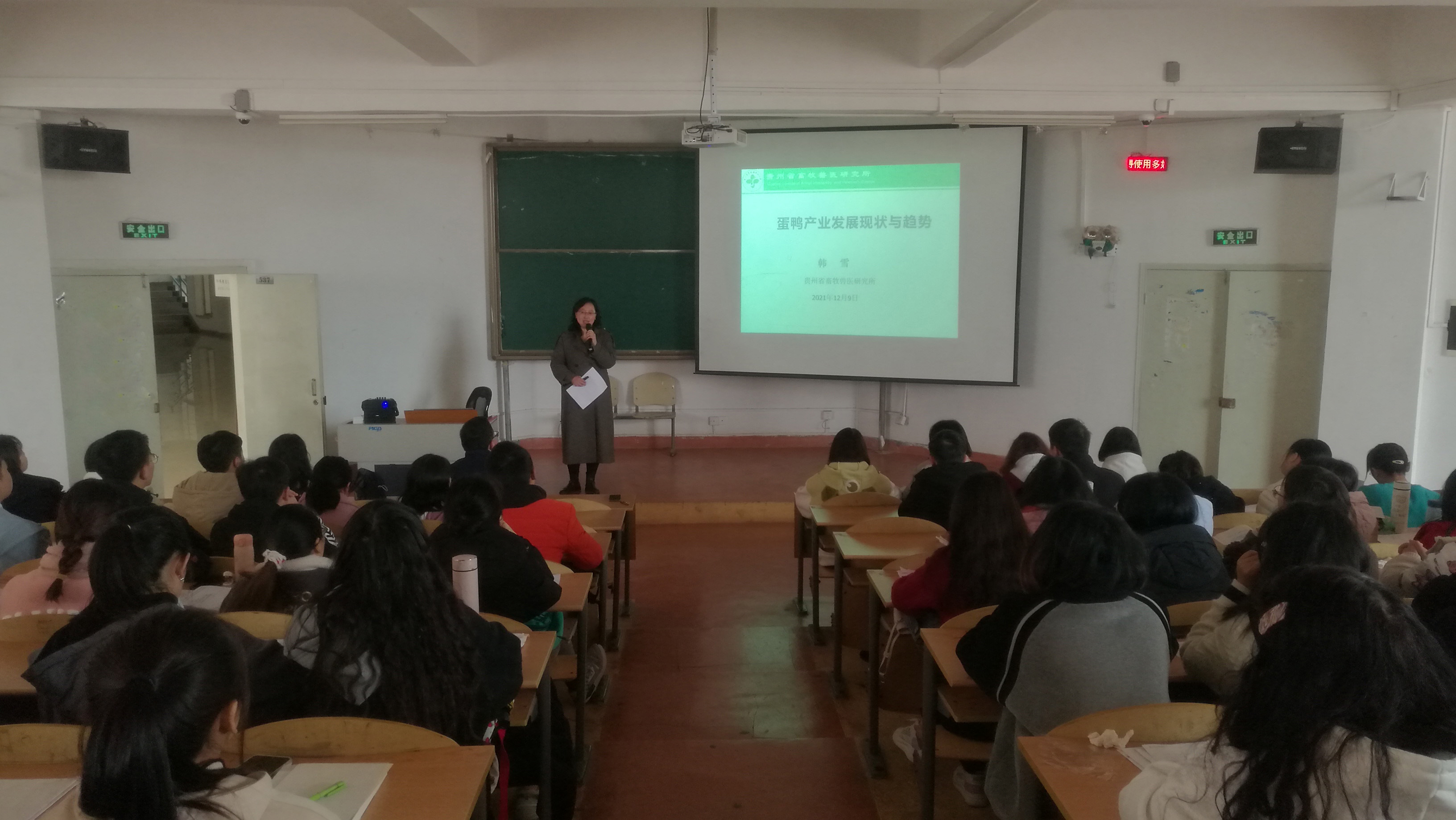 为促进威廉williamhill体育应用生物科学专业员工更好地了解专业就业前景和职业规划,关注产业发展,增强科学素养,提升员工专业自信及创新能力,12月9日,公司邀请贵州省畜牧兽医研究所家禽研究室副主任、高级畜牧师韩雪于宁静楼537开展“蛋鸭产业发展现状及趋势”专题讲座。贵州省畜牧兽医研究所办公室主任王胤晨,威廉williamhill体育经理刘讯、教学科研科科长吴超,2019级、2020级及2021级应用生物科学专业全体员工参加讲座,讲座由吴超主持。