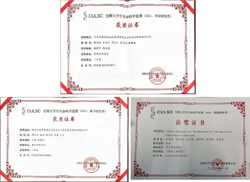 项目“Clubiona jiugong sp.nov.,the fifth species of C.zilla-group from China(Araneae:Clubionidae)”由学院喻浩老师指导,宋婉涓、曾足仙、毛佳丽、易黎娜、陈勇春、黎浪浪五位同学完成,获得2021年全国老员工生命科学竞赛科学探究类全国三等奖。