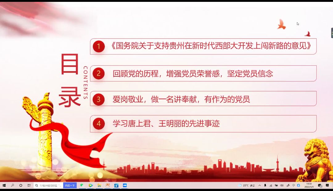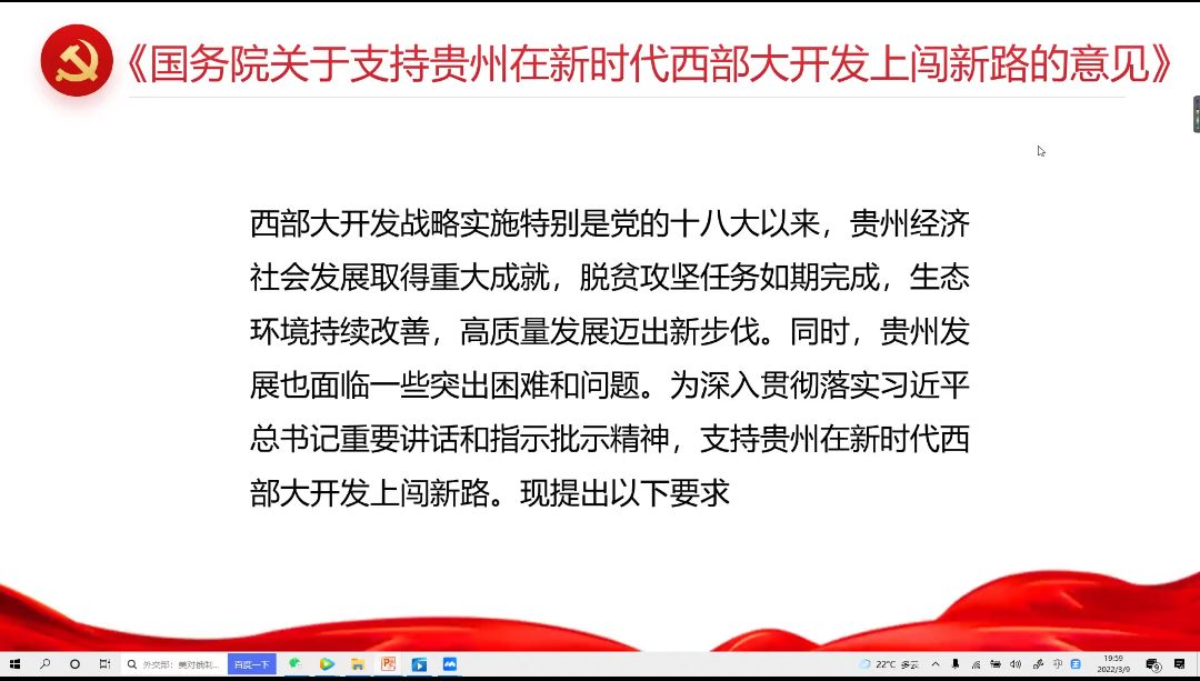 3月9日晚,生物科学专业员工党支部于腾讯会议开展《国务院关于支持贵州在新时代西部大开发上闯新路的意见》(国发〔2022〕2号)文件的学习。活动由员工党员张冬芹组织,员工党支部书记王溯与全体员工党员参加。