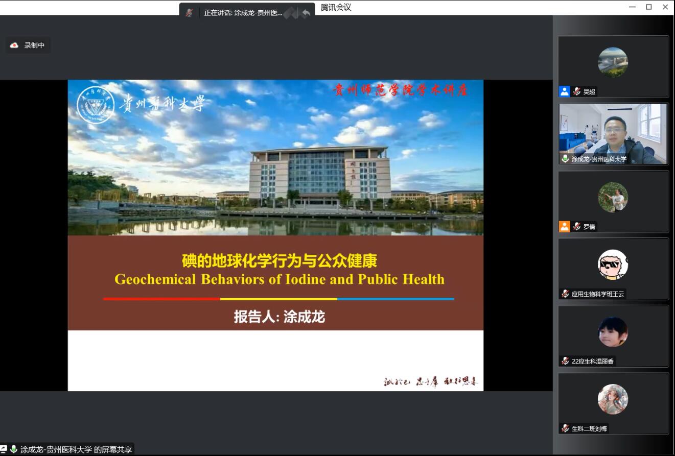 为营造良好的学术氛围,拓展学术领域,丰富学习生活,10月18日,威廉williamhill体育邀请贵州医科大学涂成龙教授在公司开展线上“碘的地球化学行为与公众健康”学术讲座。公司罗倩教授主持,生物科学专业和应用生物学科学专业员工及部分老师参加讲座。