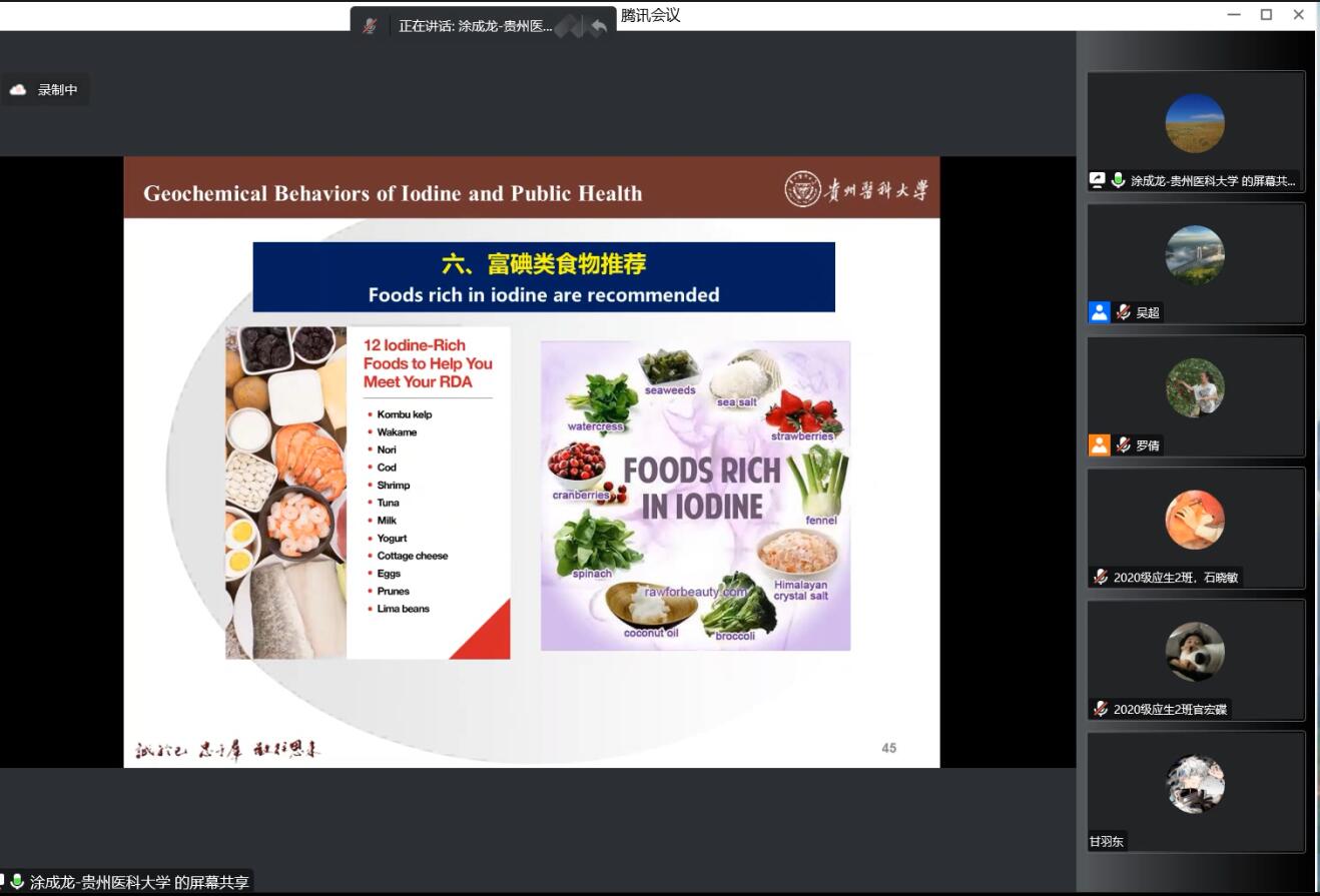 罗倩对涂成龙教授做讲座表示热烈欢迎和感谢,并简要介绍其学术情况,同学们也在发言框对涂教授的到来表示热烈的欢迎。讲座中,涂成龙教授从碘的发展历程、碘的健康效应和摄入标准、全球人群碘缺乏的分布情况、碘的地质大循环、土壤碘向植物转移和影响因素以及富碘类食物推荐等六个方面为同学们进行了详细的介绍,并向同学们科普了全国防治碘缺乏病日,并与同学们热情互动,让同学们对防治碘缺乏有了进一步的认识和理解。