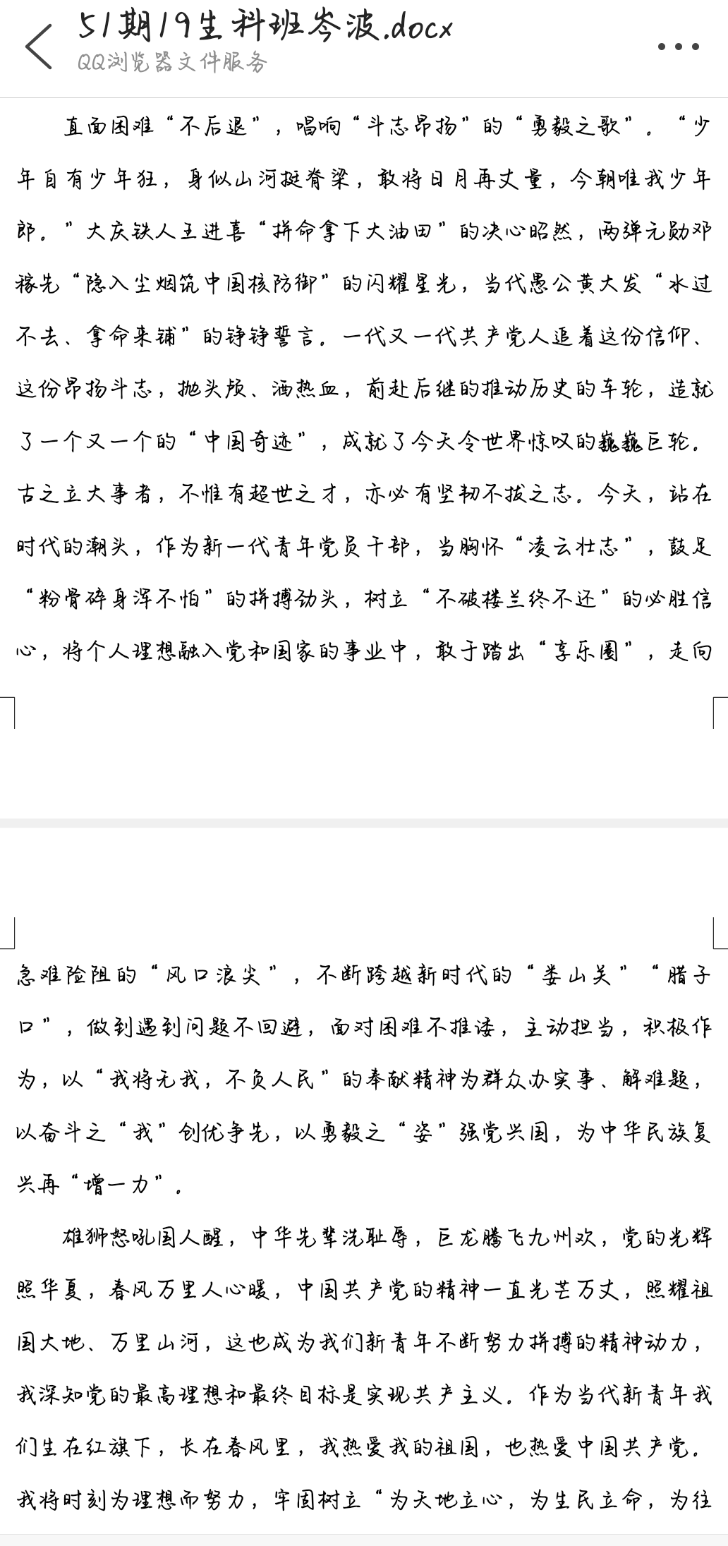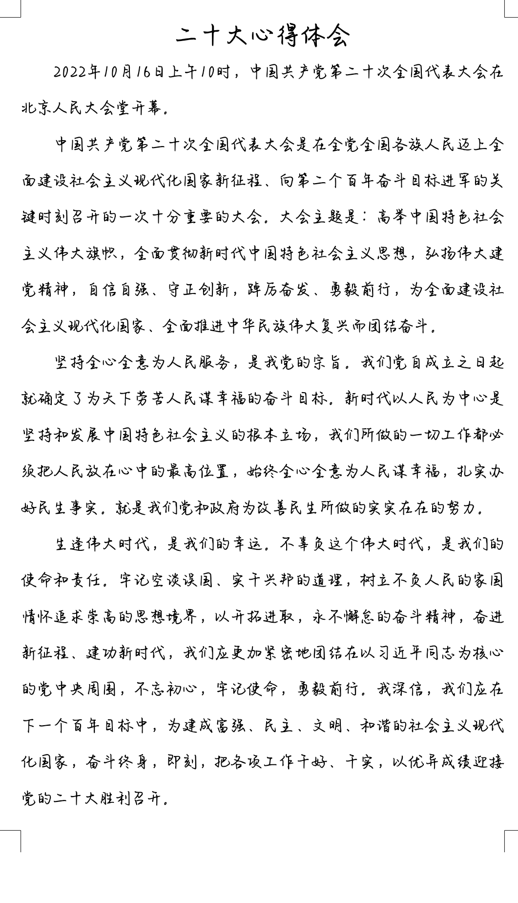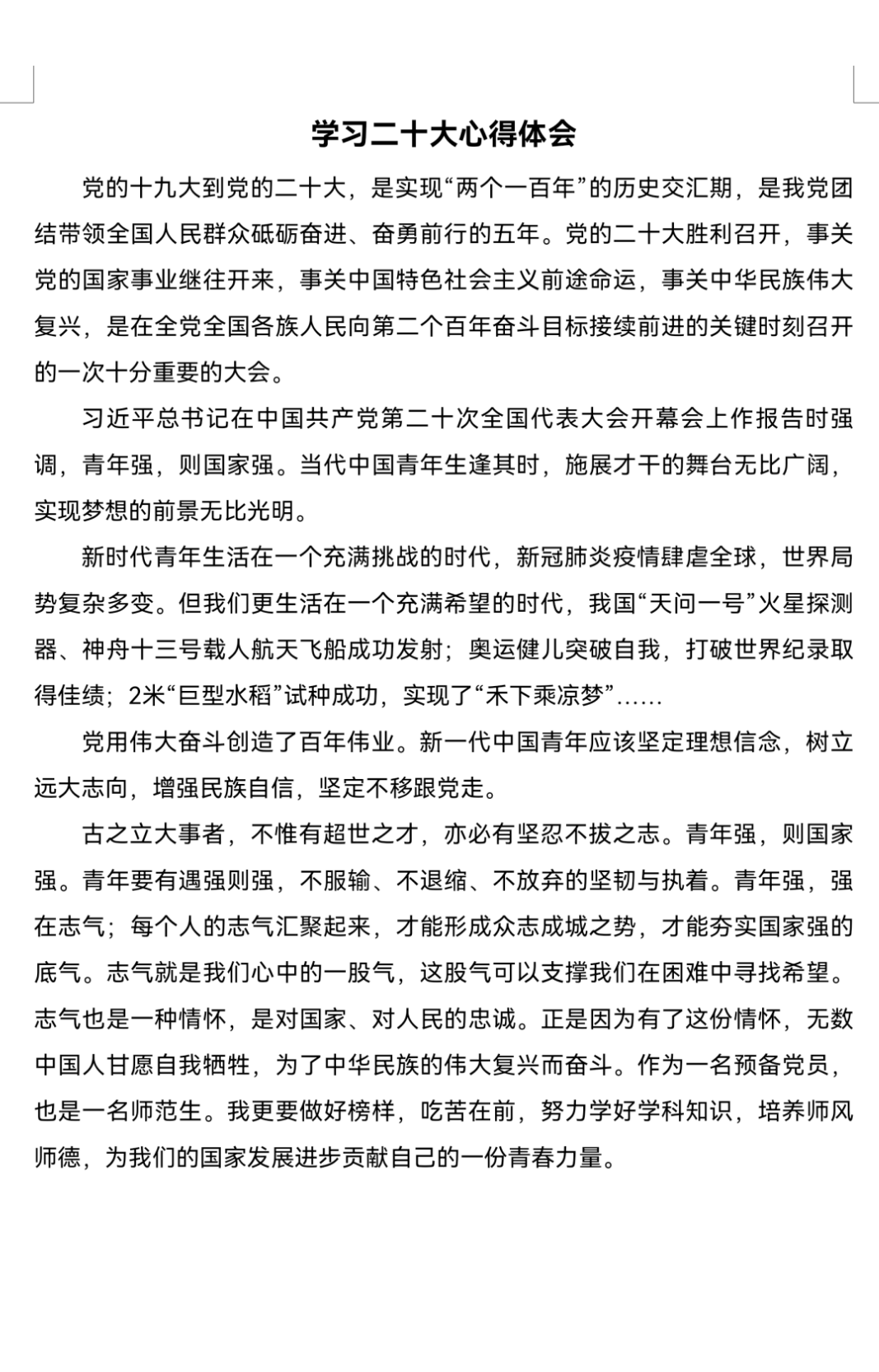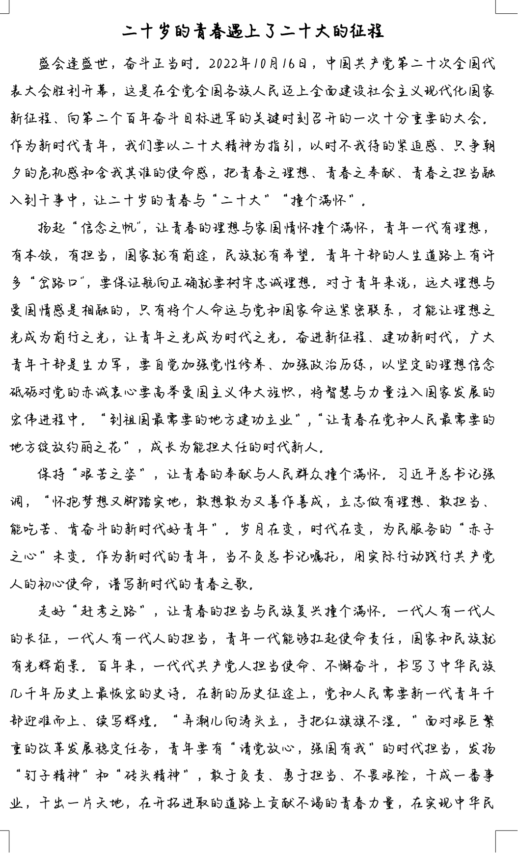 十年成就鼓舞人心,宏伟蓝图催人奋进。大家在认真研读习近平总书记所作的报告后,倍感振奋、深受鼓舞,写下一篇篇感受颇深的心得。李桃二同学的“古之立大事者,不惟有超世之才,亦必有坚韧不拔之志”。毛佳丽同学的“生逢伟大时代,是我们的幸运。不辜负这个伟大时代,是我们的使命和责任……”余成绎同学的“要加强学习和改进,努力去成为更好的自己,为将来自己能够有能力站在三尺讲台,为祖国的发展尽自己的一份力!”还有很多同学写道要紧跟党的步伐,一步一个脚印,听党指挥,为党和人民战斗。字里行间可以感受到青年昂扬向上的精神面貌,奋力谱写新时代的青春之歌。党的二十大报告精神是思想上“定盘针”,是行动上的“指南针”,我们要结合自身来对照党的二十大报告找结合点,对照自己存在的不足,通过学习党的二十大报告精神的先进思想进行整改,那么学习的精神才能很好的转化为学习的动力。