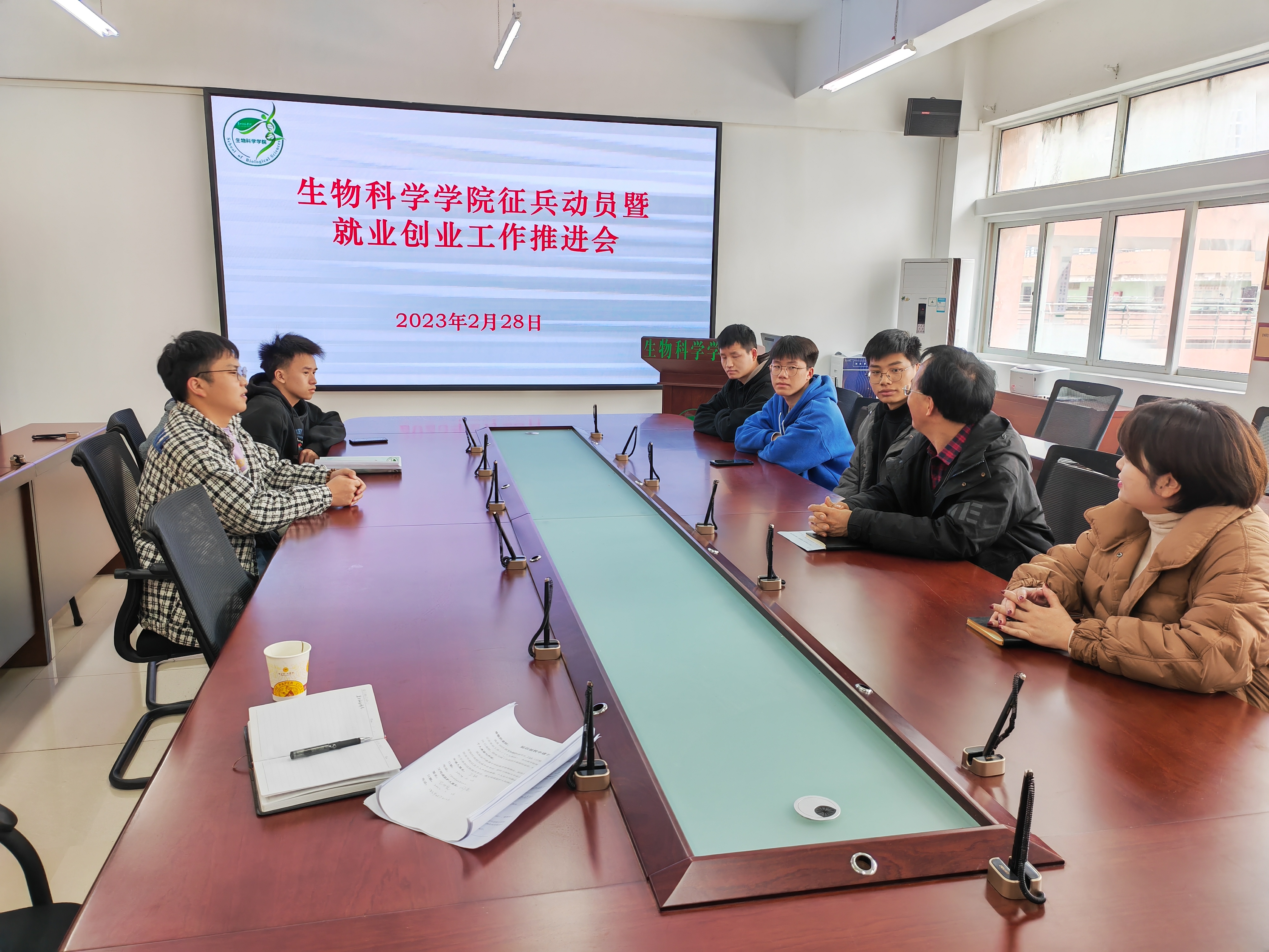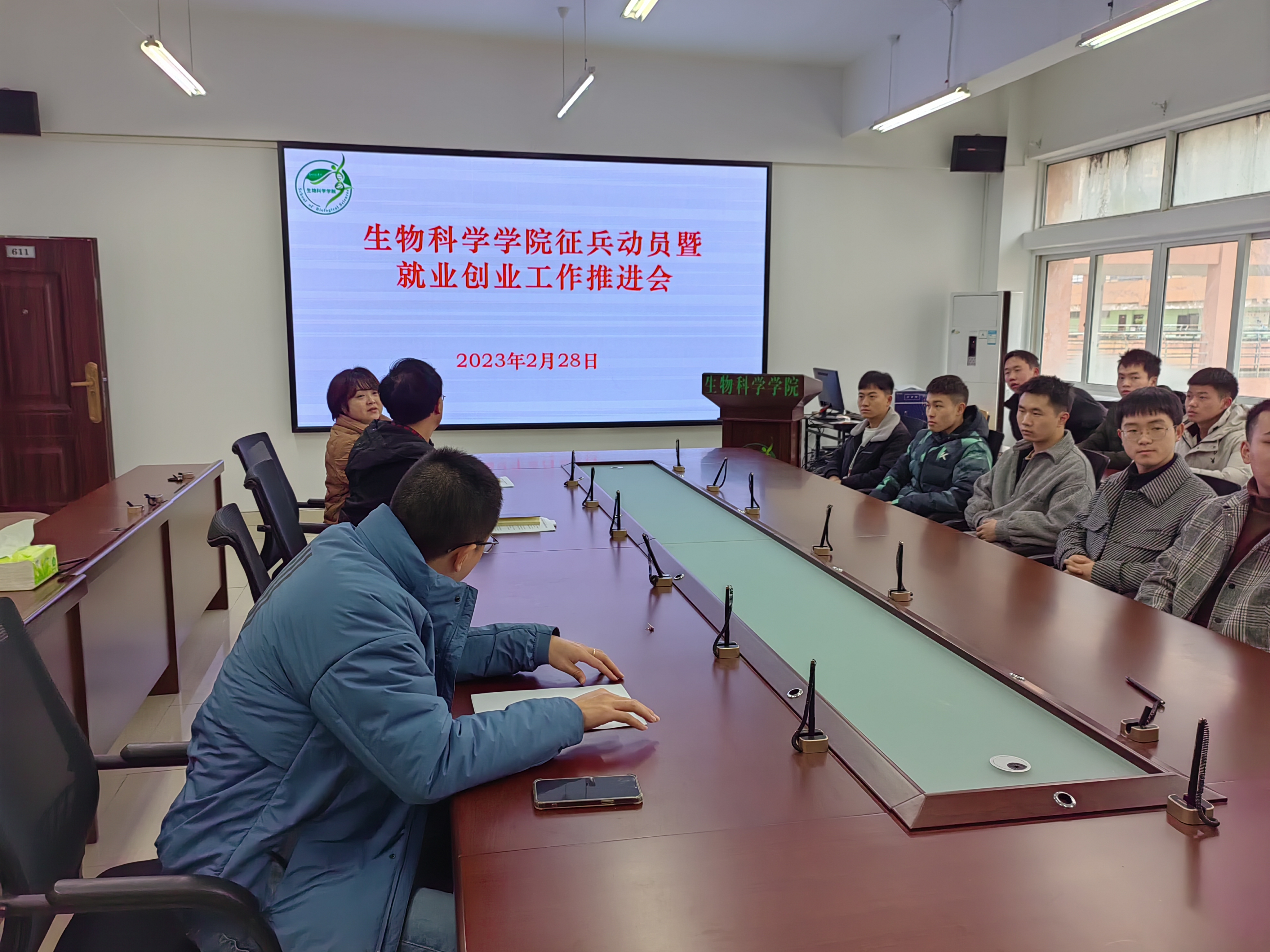 2023年2月28日,威廉williamhill体育组织2019级全体男生开展威廉williamhill体育征兵动员暨就业创业工作推进会,生物科学公司党委书记孙秀华、党委副书记王珏、班主任张运林和丁波出席会议。