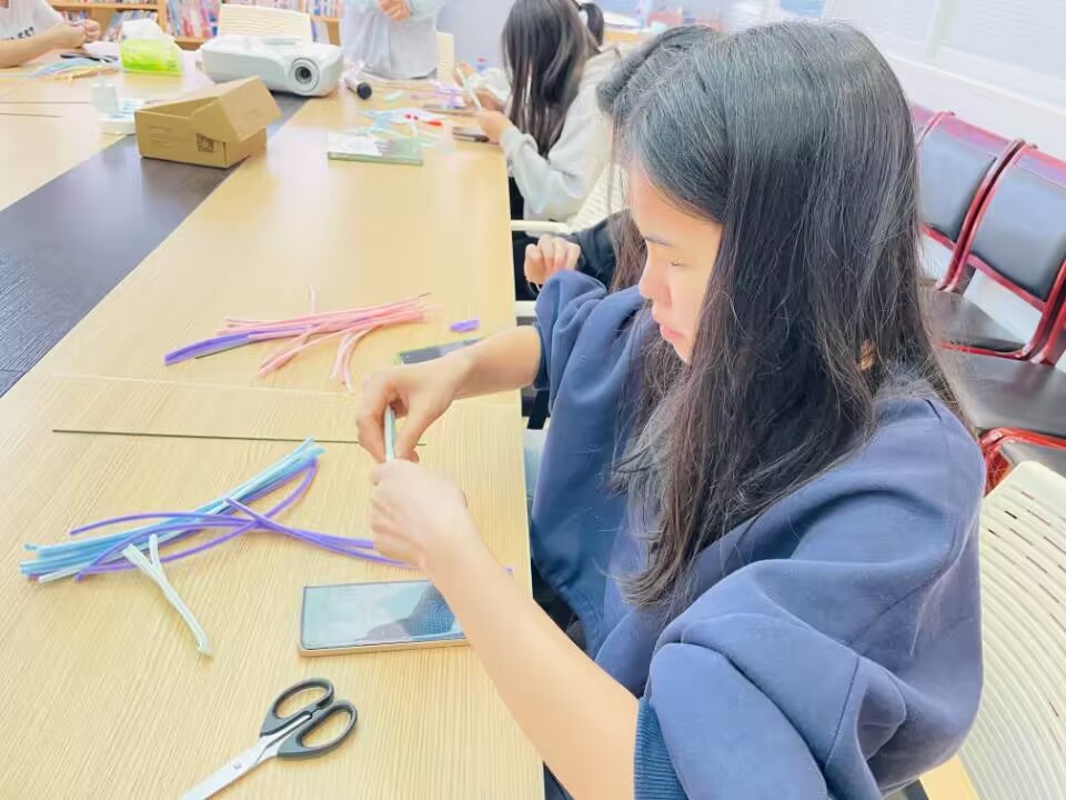 活动的开始由“一站式”的工作人员对活动主题进行简单的介绍和开场。然后宣布了本次比赛的规则:各位同学领取材料扭扭棒,接着进行简单的绒花制作,最后通过在场的人员根据各位选手的作品投出三票,最终确定作品的名次。活动进行时每位参与者都精心的进行着绒花的制作,通过前期在网上所学的绒花花瓣、根、叶子的教程以及个人的奇思妙想,再结合自己的能力制作出绒花。制作完成后,工作人员将作品收集上来进行编号,展示给在场的人员,最后在场的人员根据自己的喜好,以及绒花的造型投票。活动的最后,由工作人员宣布获得一、二、三等奖的选手。为她们颁上奖品。活动接近尾声,工作人员对本次活动做出总结,并合影留念。