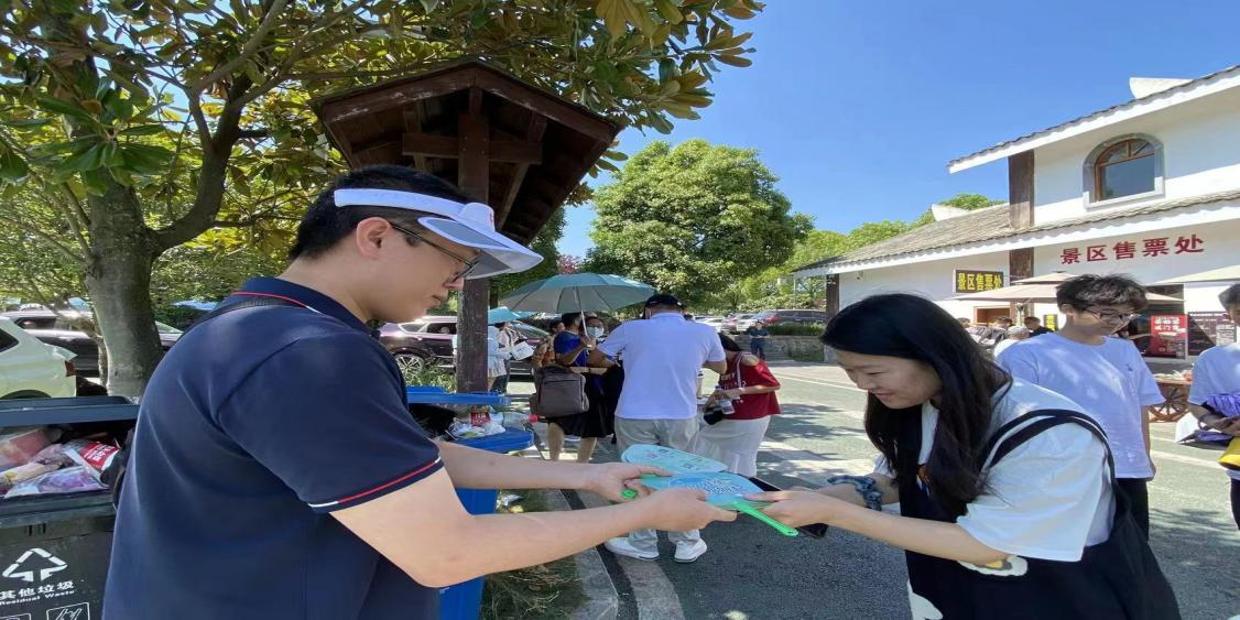 当日上午9:00,志愿服务队一行14人在威廉williamhill体育教师陈运泽博士的带领下,抵达青岩古镇景点北门。服务队当日活动主要是开展垃圾分类有关宣传,并准备了200余把印刷有垃圾分类小知识的扇子。队员们按照分工,将扇子分发给来往的游客,并讲解扇子上有关垃圾分类的内容,通过寓教于乐的方式引导游客低碳生活、培养垃圾分类的意识。活动过程中,志愿者两人一组按照工作部署安排,分散到景区内外各处分发扇子。在分发过程中,引导游客关注并了解有关垃圾分类的相关知识,呼吁游客身体力行,实行垃圾分类。