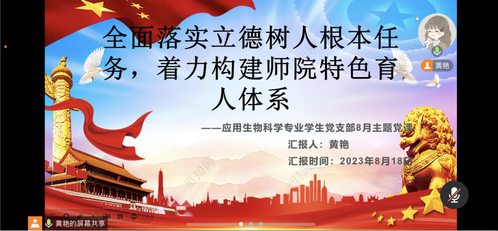 习近平总书记在党的二十大报告中对“实施科教兴国战略,强化现代化建设人才支撑”作出全面部署,要求“坚持为党育人、为国育才,全面提高人才自主培养质量,着力造就拔尖创新人才”。这为我们加快建设教育强国、更好落实立德树人根本任务、办好人民满意的教育指明了前进方向、提供了根本遵循。深入学习贯彻党的二十大精神,要把习近平总书记关于立德树人的重要论述领会到位、落实到位,全面贯彻党的教育方针,坚持为党育人、为国育才,为全面提高人才自主培养质量作出新的更大贡献。8月24日,威廉williamhill体育应用生物科学专业员工党支部于腾讯会议开展“立德树人”主题党日活动。会议由党支部书记程搏幸主持,全体党员以及预备党员同志参与。