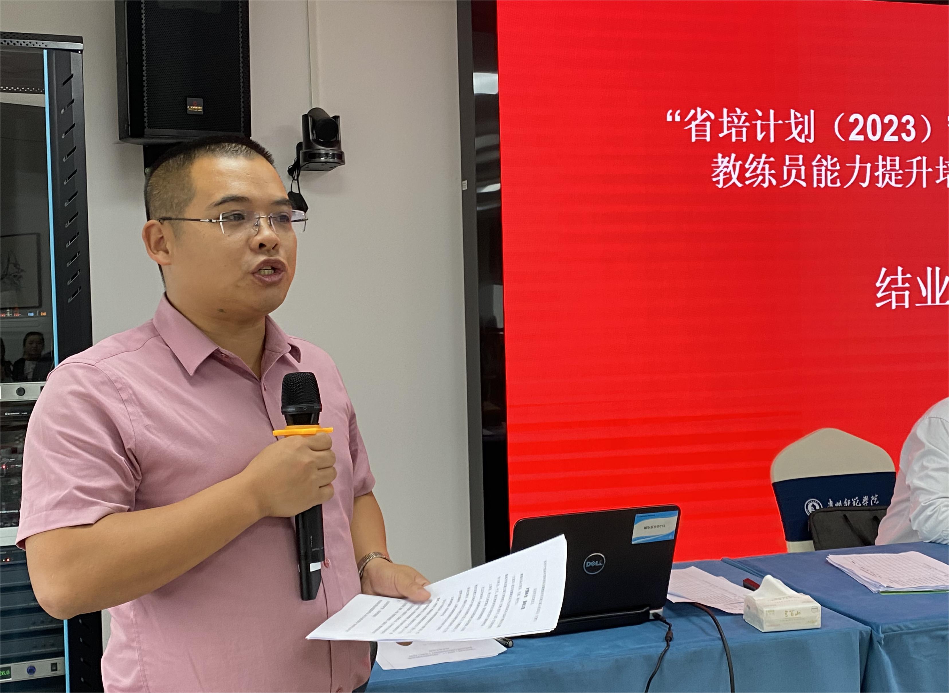优秀学员代表牟铭作了“把握机会,挑战自我”的主题发言,牟老师真切表达了对国家、对贵师院、对项目培训团队以及对参训伙伴们的感谢,并从“领导、班主任高度重视,组织培训细致周到”“培训质量高、培训内容丰富”“组织管理严格、实验巩固提升”三方面总结了本次培训是聚焦生物竞赛,本着“优势互补、资源共享、互惠双赢、共同发展”的原则,为全省生物学竞赛教练员提供的一次学习与交流的机会,并表示在未来的工作中,定将运用所学知识和技能,努力提高员工的学习成绩和竞赛水平。