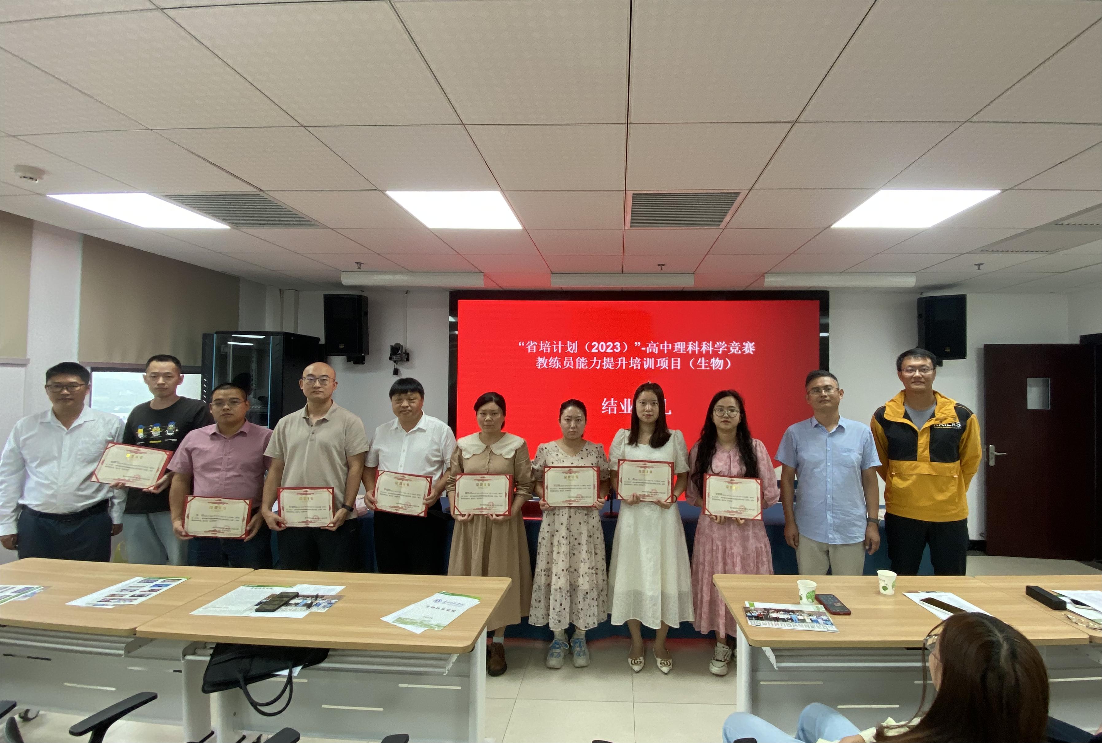 典礼开始前,“省培计划(2023)”-高中理科学科竞赛教练员能力提升培训项目(生物)组精心准备的十天培训精彩瞬间集锦小视频的播放,唤起了所有人美好而珍贵的省培回忆,掀开结业典礼序幕。暖意中,钱长江宣布了本次培训的优秀学员名单,并由刘讯、钱长江和程搏幸为牟铭等8名学员颁发优秀学员证书并合影留念。