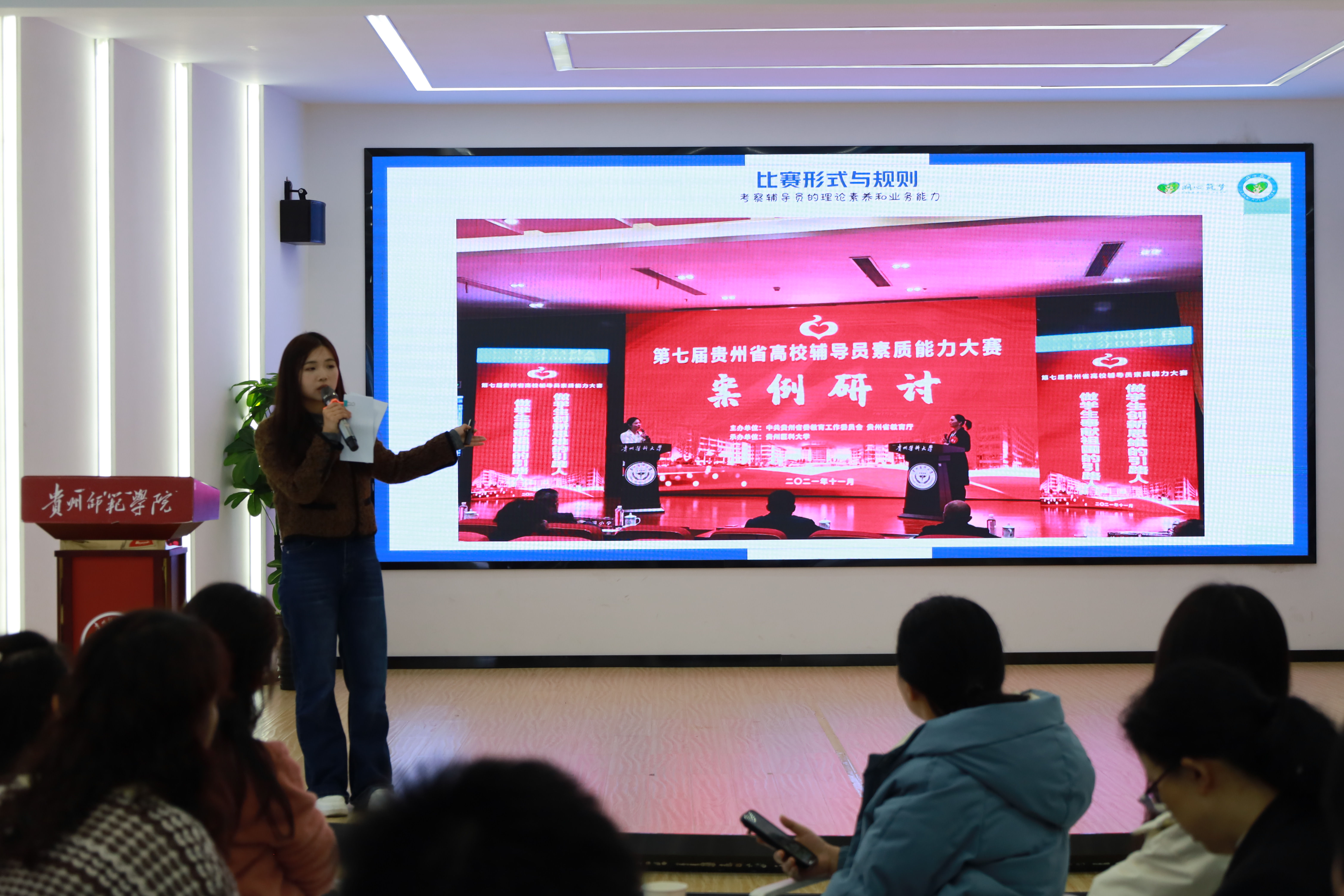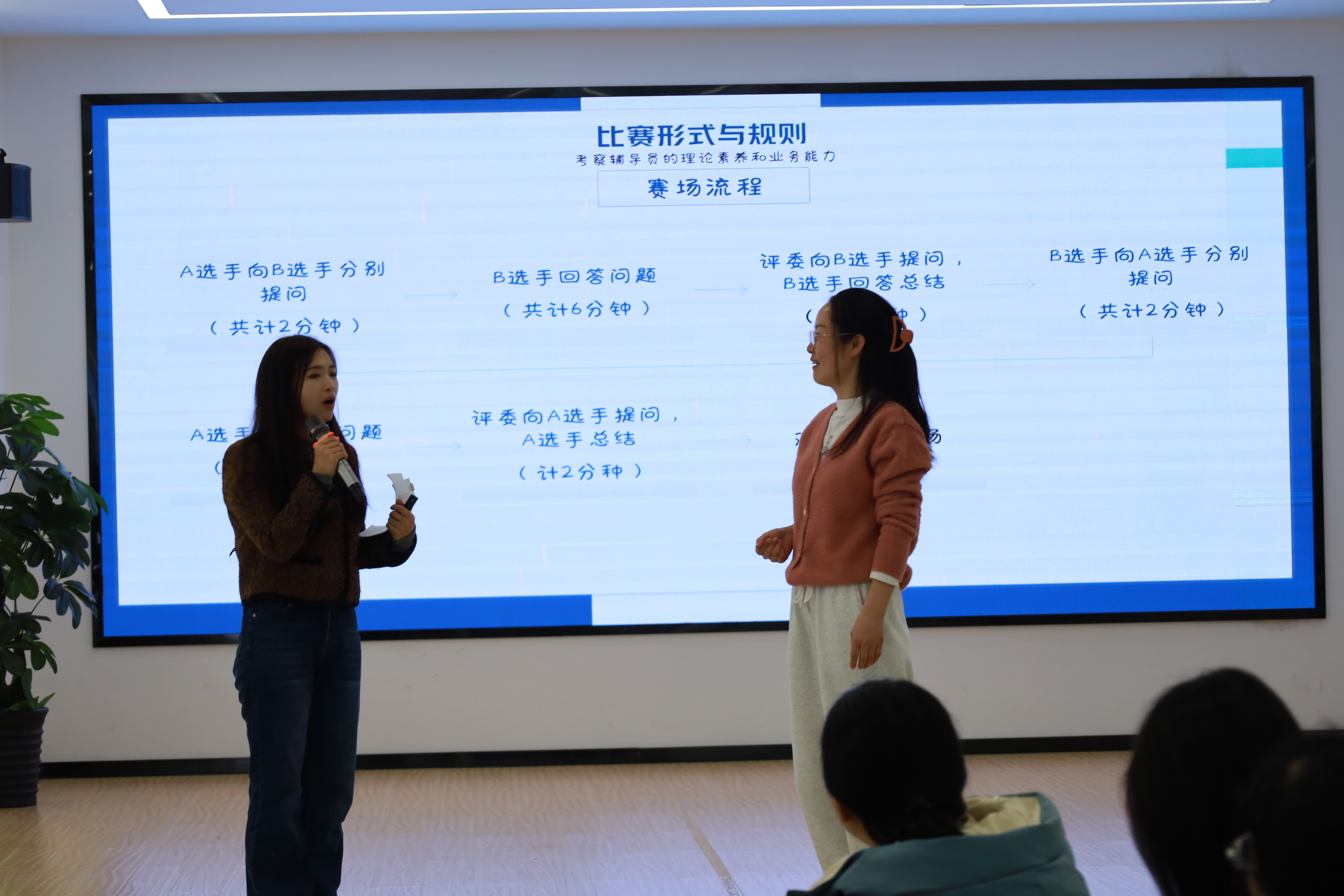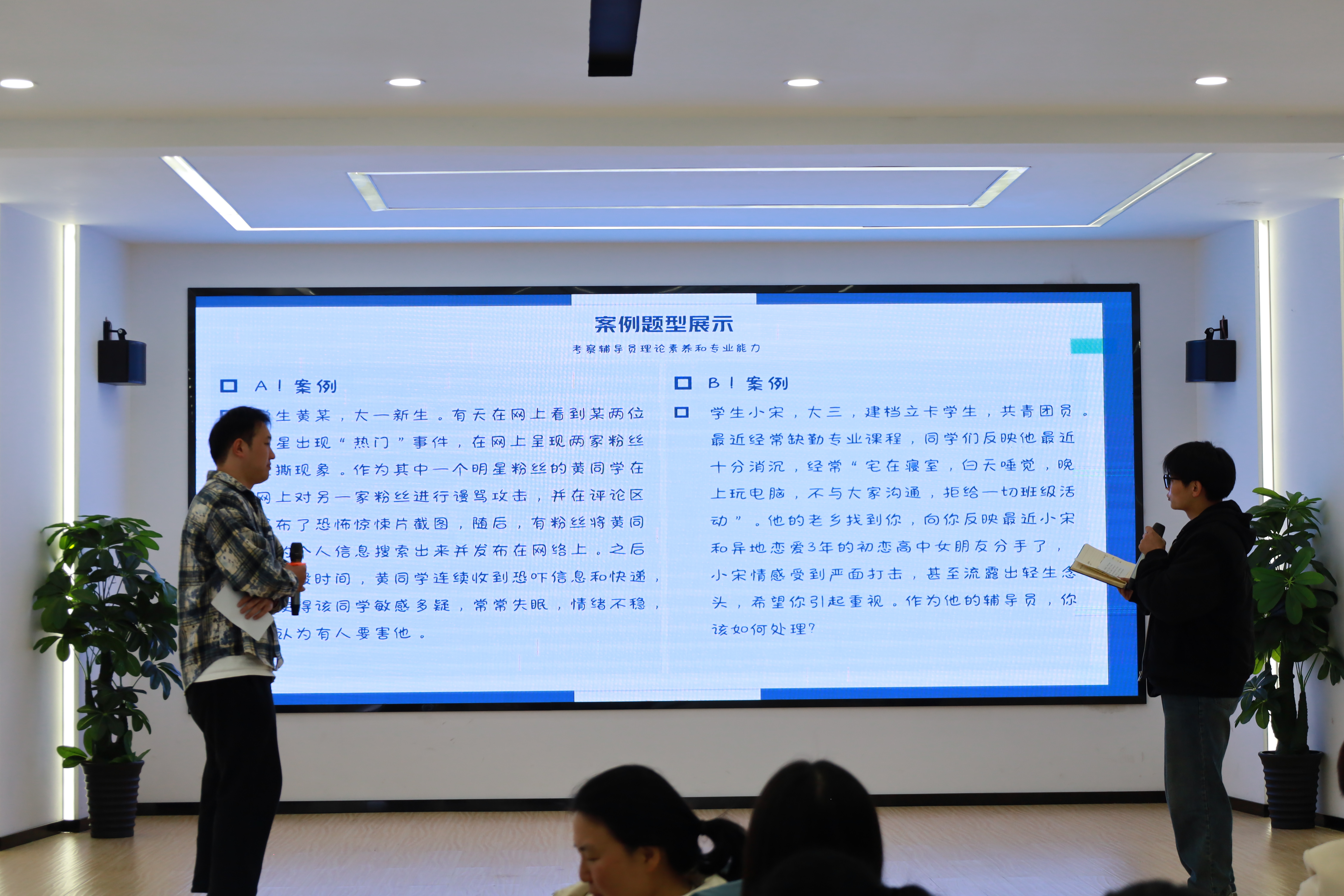 在专题辅导环节,王溯系统解析赛事规则与流程,强调要聚焦对手思维盲区,通过由浅入深的递进式发问考察应变能力。随后,开展案例实战演练环节,由两位辅导员现场还原赛事场景。王溯结合赛事模拟出现的问题,提出优化的建议:精准把控时间、善用政策文件,将具体案例提升到思政育人高度,充分展现思政魅力。