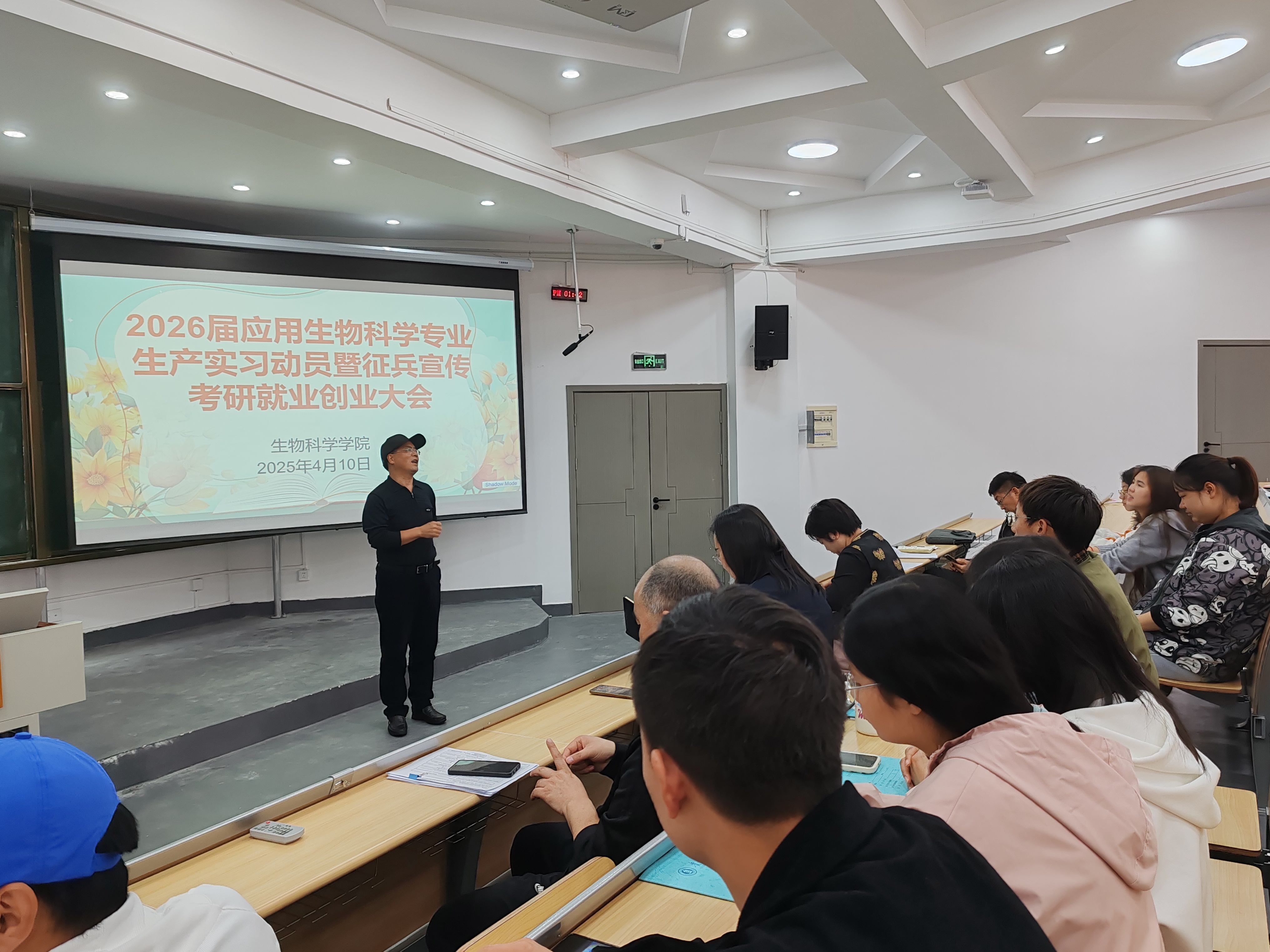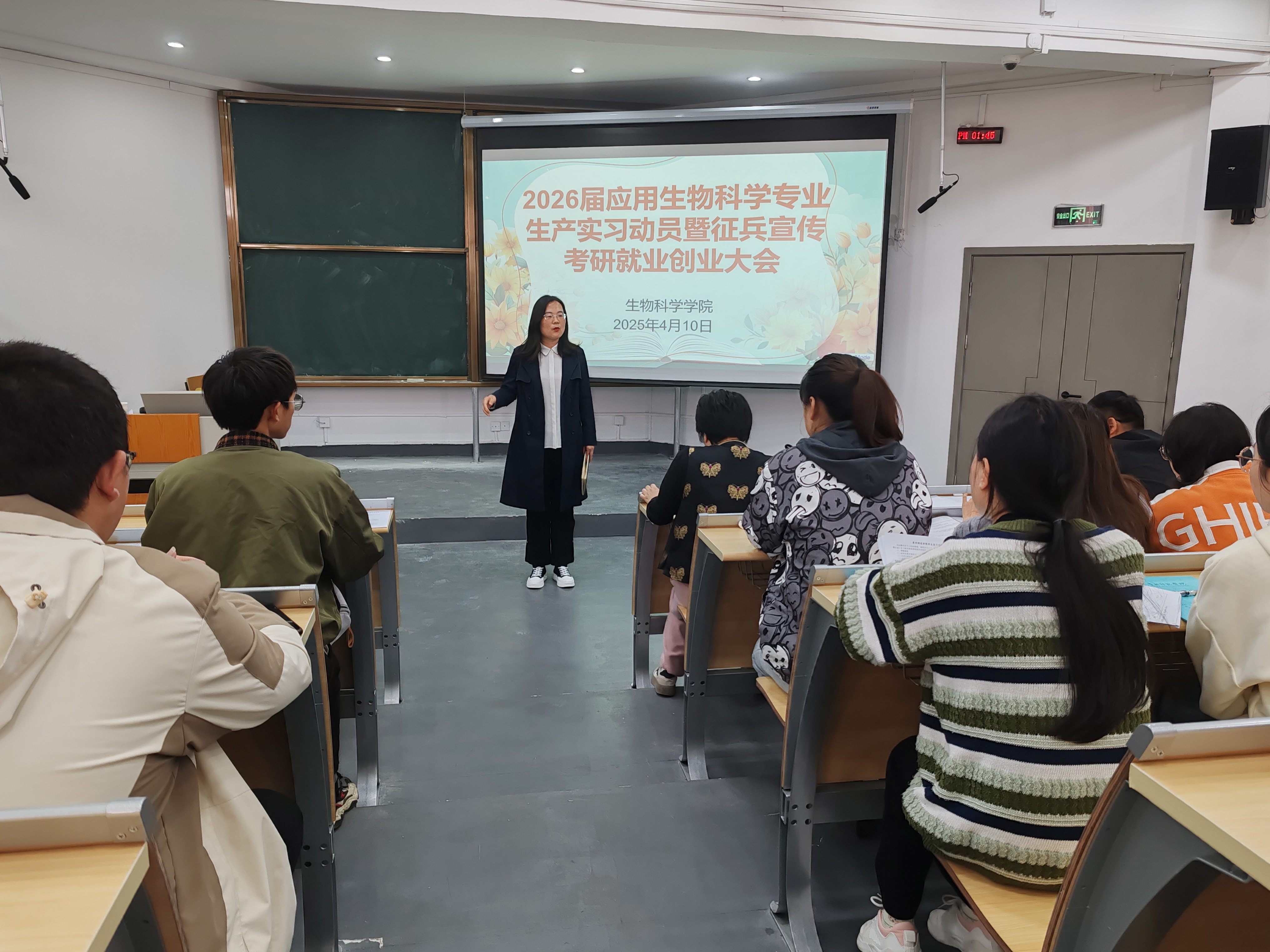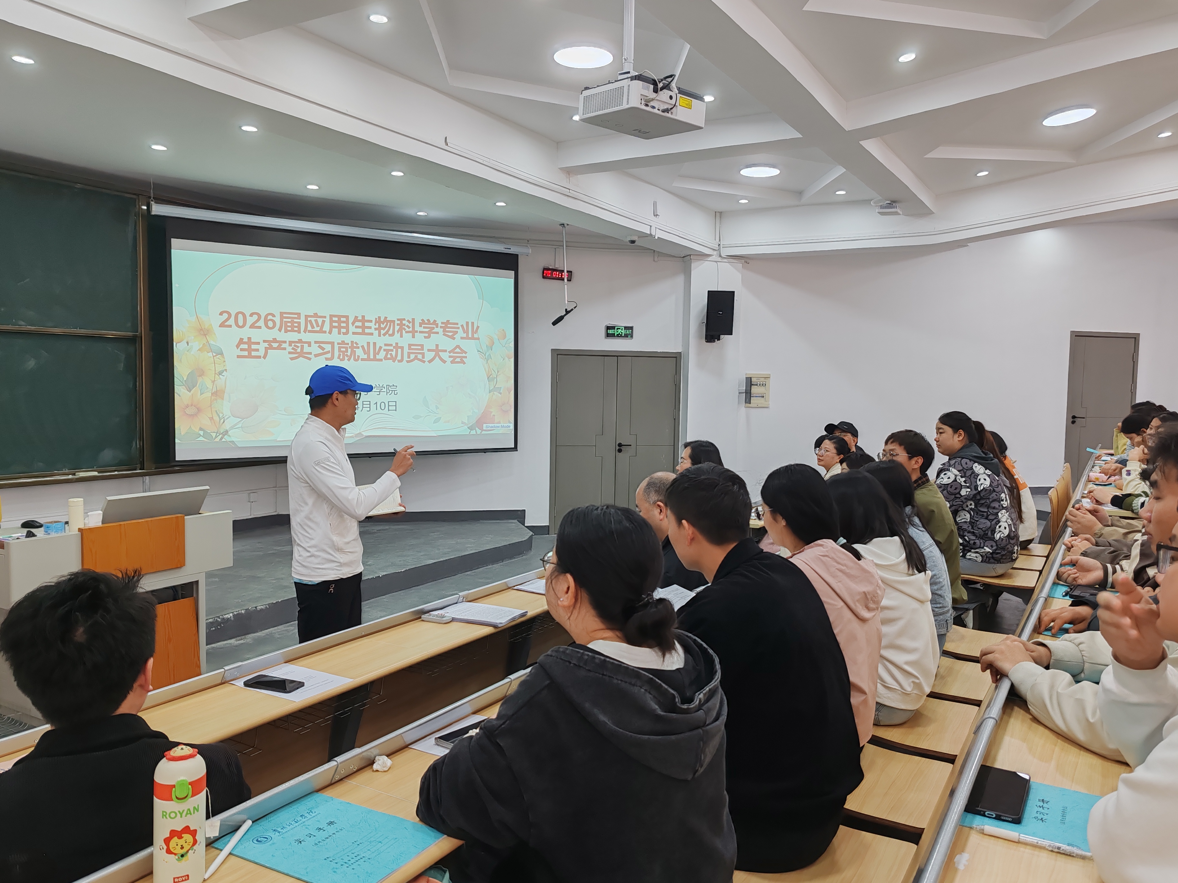 为深化产教融合、落实实践育人理念,进一步推动应用生物科学专业员工理论与实践能力双提升,威廉williamhill体育于4月10日在宁静楼537教室召开了2026届应用生物科学专业生产实习动员总结暨征兵宣传考研就业创业大会。参加会议的有公司党委书记孙秀华、经理兼党委副书记任翠娟、党委副书记王珏、副经理钱长江、副经理孟泽彬、系主任程搏幸、辅导员李育芳、生产实习兼职管理员陈运泽、员工导师彭雪梅、员工导师兰世超、2022级应用生物科学专业全体同学及2021级应用生物科学专业员工代表,会议由陈运泽主持。