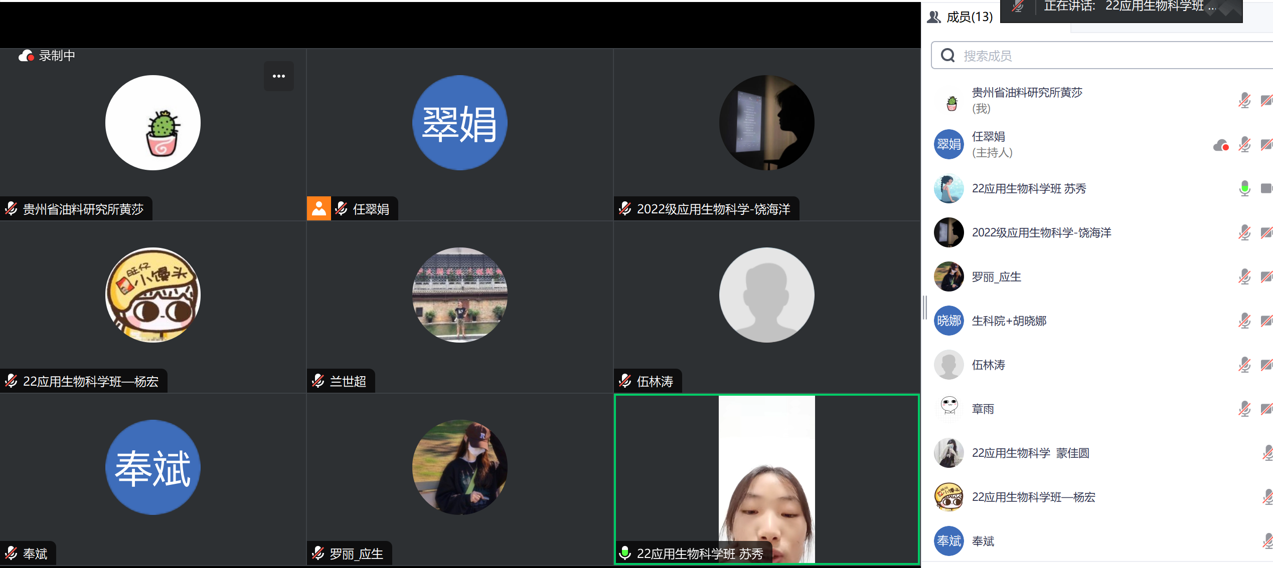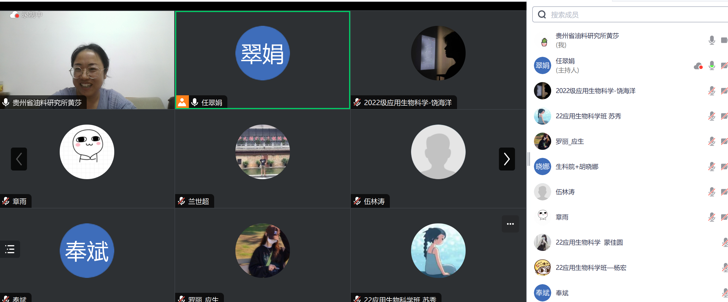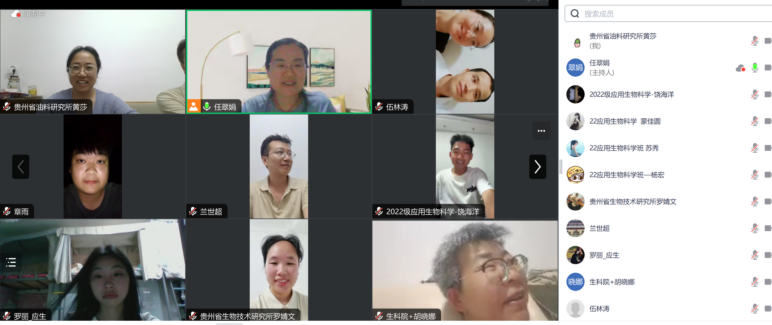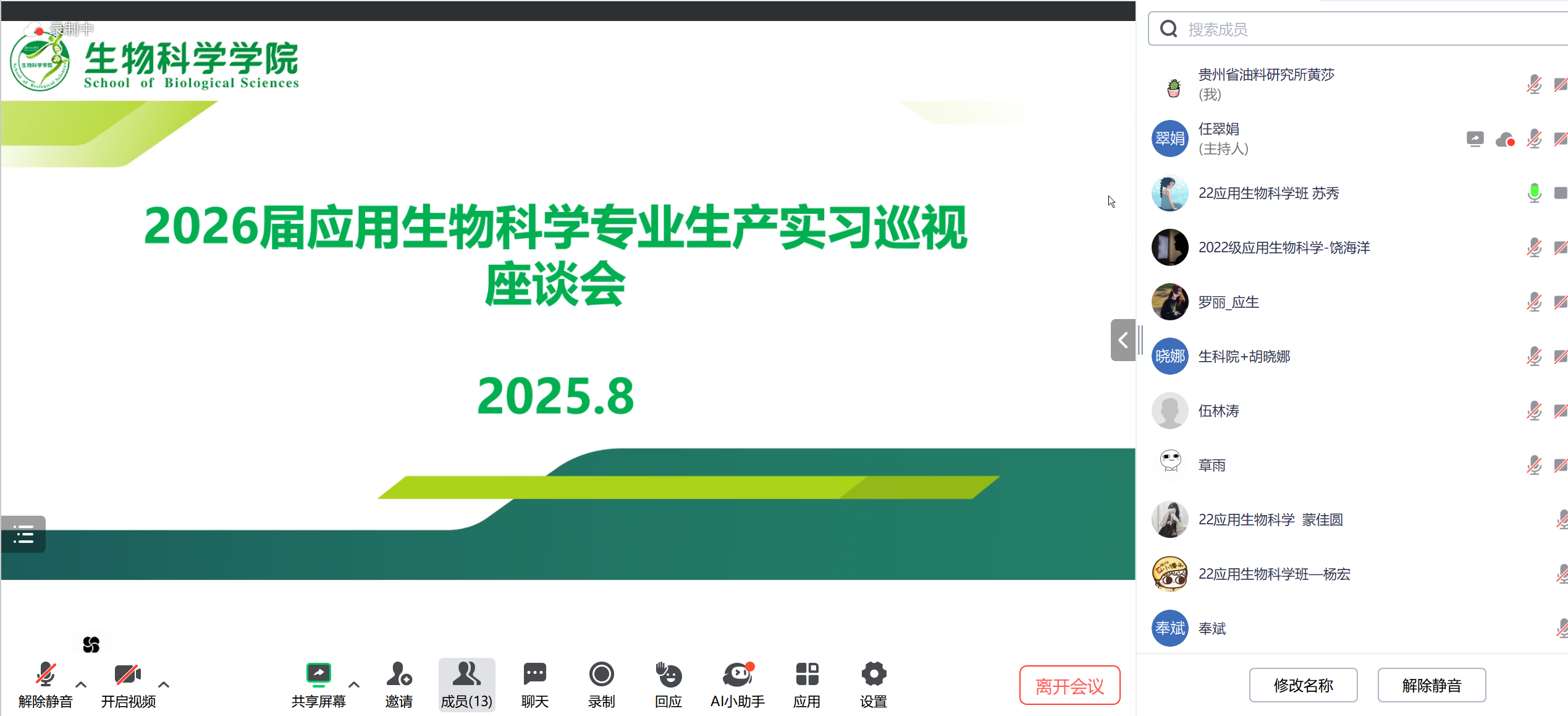 为深化产教融合实效,精准把脉实习质量,2025年8月6日晚,威廉williamhill体育通过腾讯会议平台召开2026届应用生物科学专业生产实习线上巡视(第二小组)座谈会。公司经理任翠娟主持会议,校外实习导师奉斌(贵州省油料研究所)、黄莎(贵州省油料研究所)、罗婧文(贵州省生物技术研究所),校内导师伍林涛、兰世超、胡晓娜及小组5名实习生共聚云端,共商实践育人新路径。
