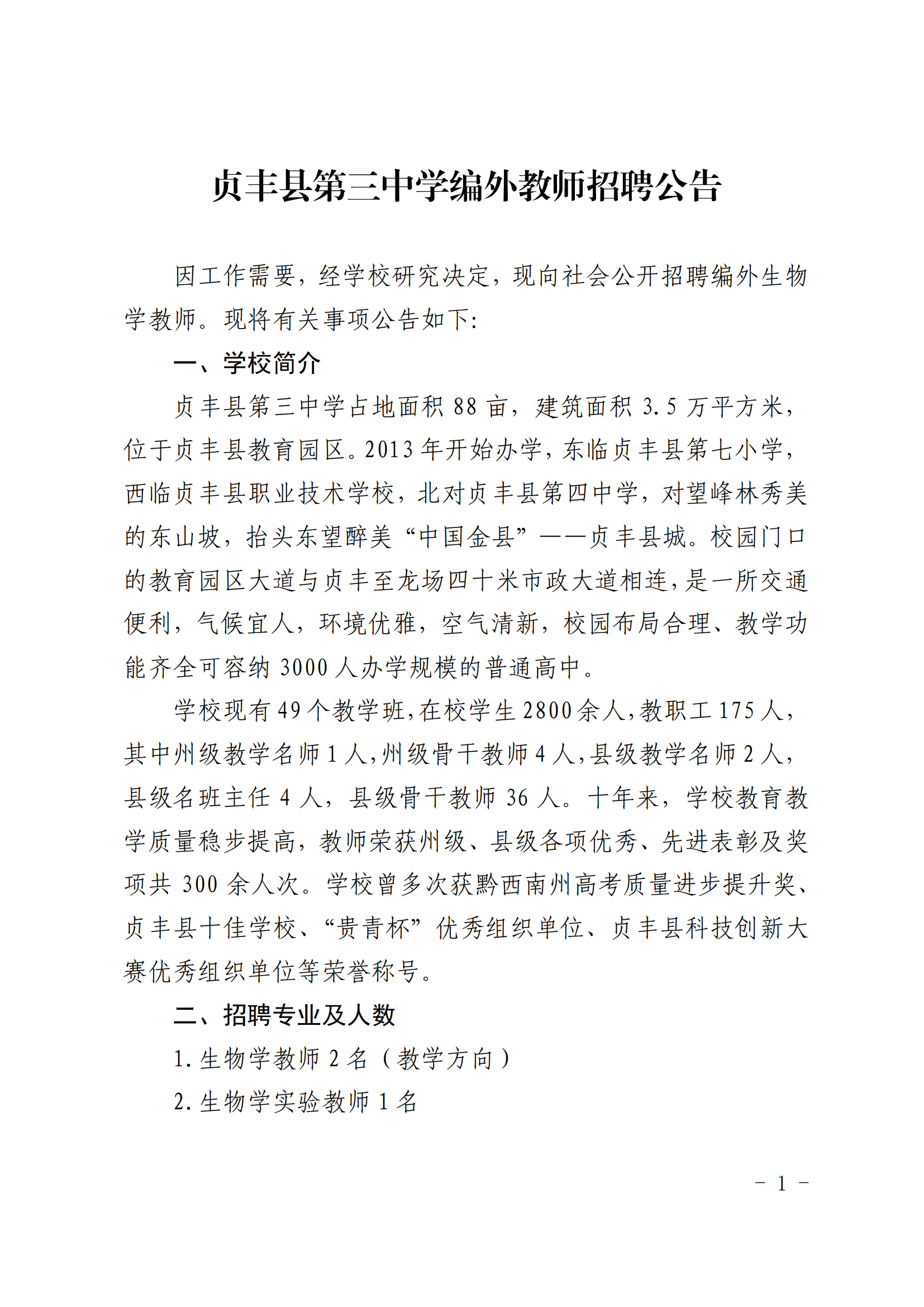 【教师招聘】贞丰县第三中学编外教师招聘公告